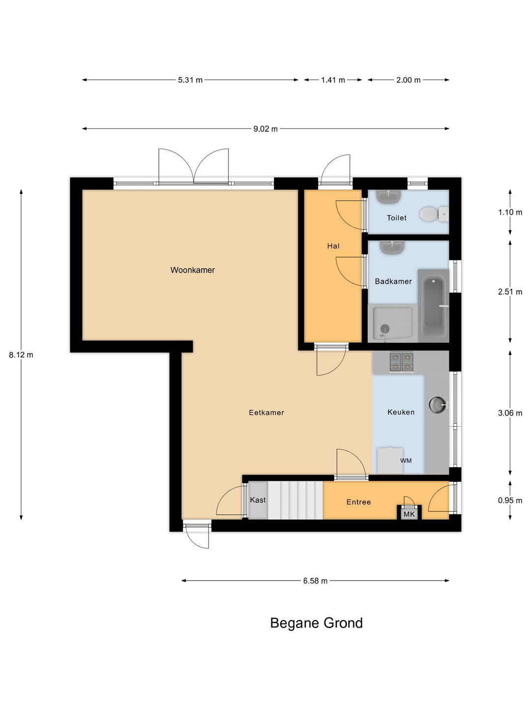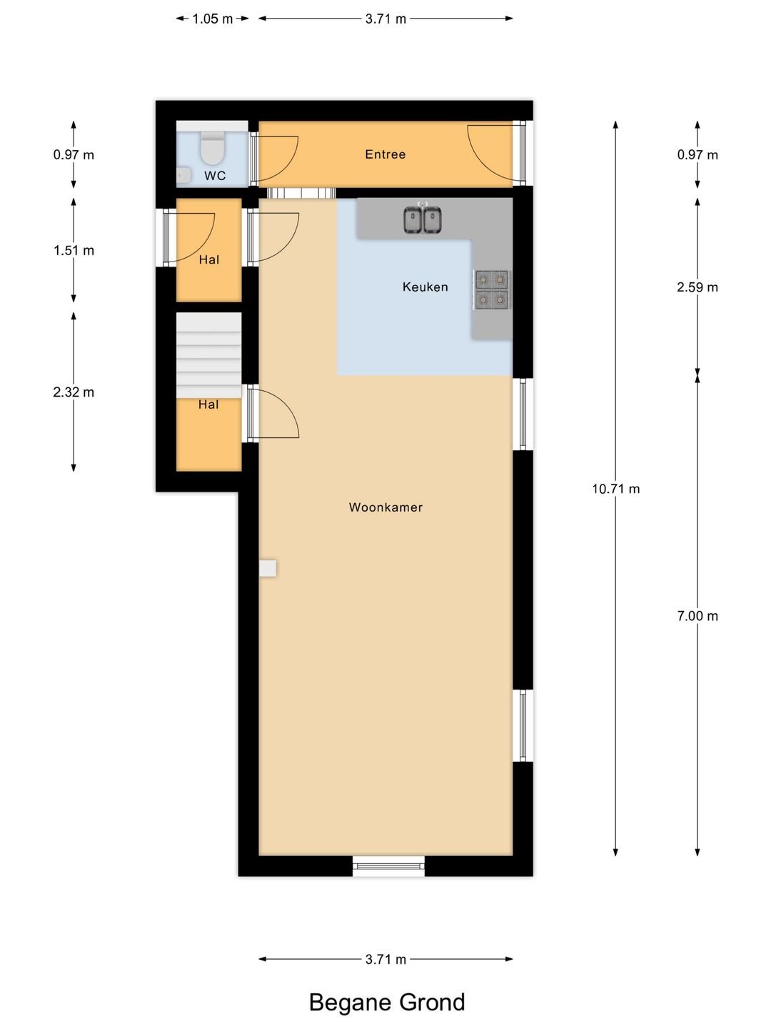 Entree, meterkast, opgang naar de eerste verdieping, open keuken met gaskookplaat, oven, losse koelkast, afzuigkap, wasmachineopstelling en trapkast, Z-woonkamer met grote pui met dubbele deuren naar de tuin.