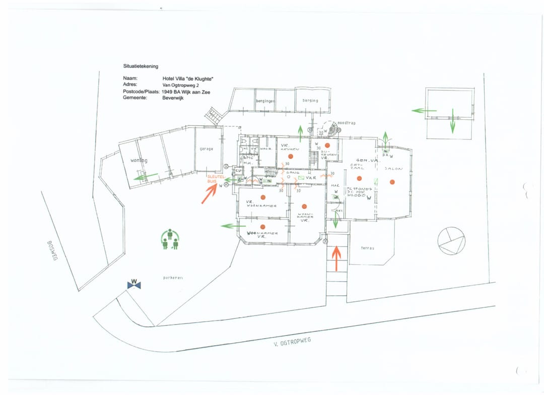 Op de hoek van de Bosweg en de Van Ogtropweg bevindt zich de entree naar het parkeerterrein. Er is plaats voor ca. 9 auto’s (in de meeste straten in Wijk aan Zee kan overigens vrij geparkeerd worden). Op het terrein, achter de parkeerplaatsen bevindt zich een woning die onderdeel uitmaakt van het aangeboden object. Vanaf de Van Ogtropweg bevindt zich de hoofdentree naar het restaurant. Aan deze zijde bevindt zich eveneens het heerlijk gelegen voorterras.
