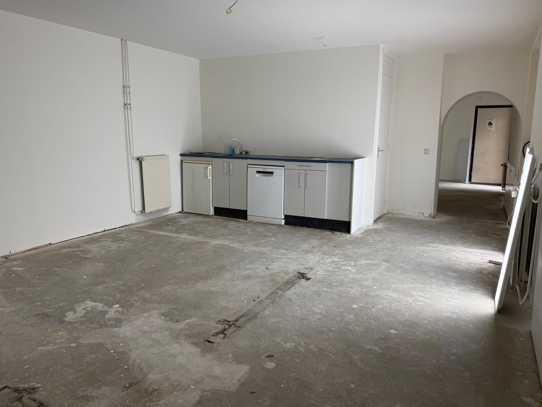 Er zijn enkele dragende muren maar er is een grote, functionele en overzichtelijke ruimte ontstaan.