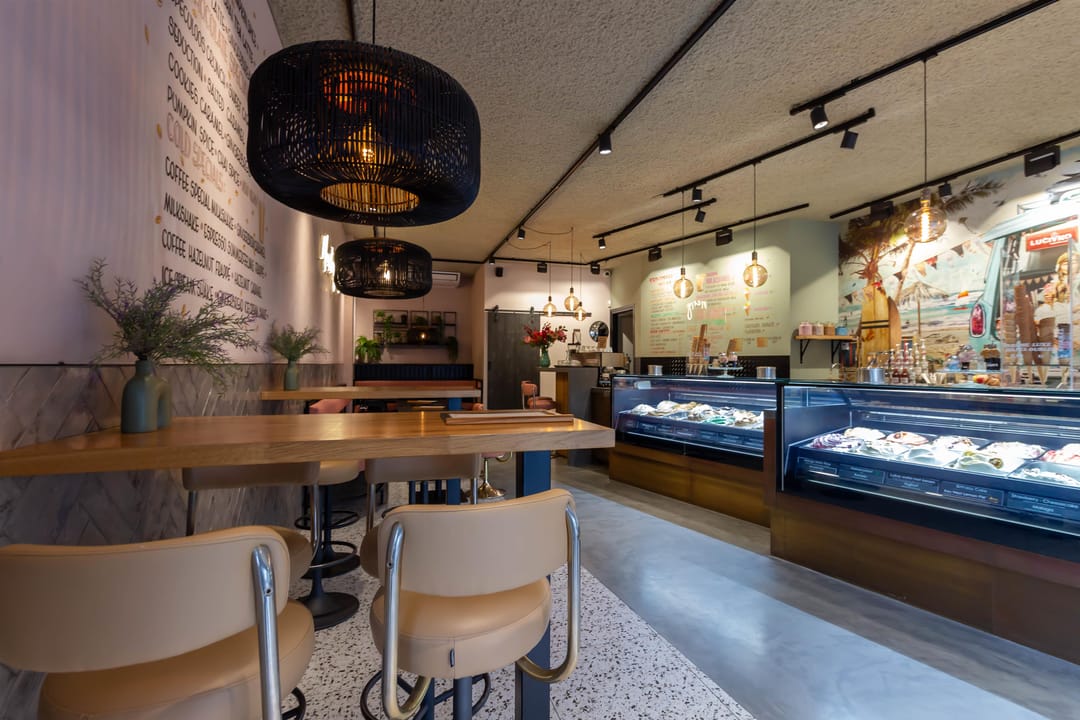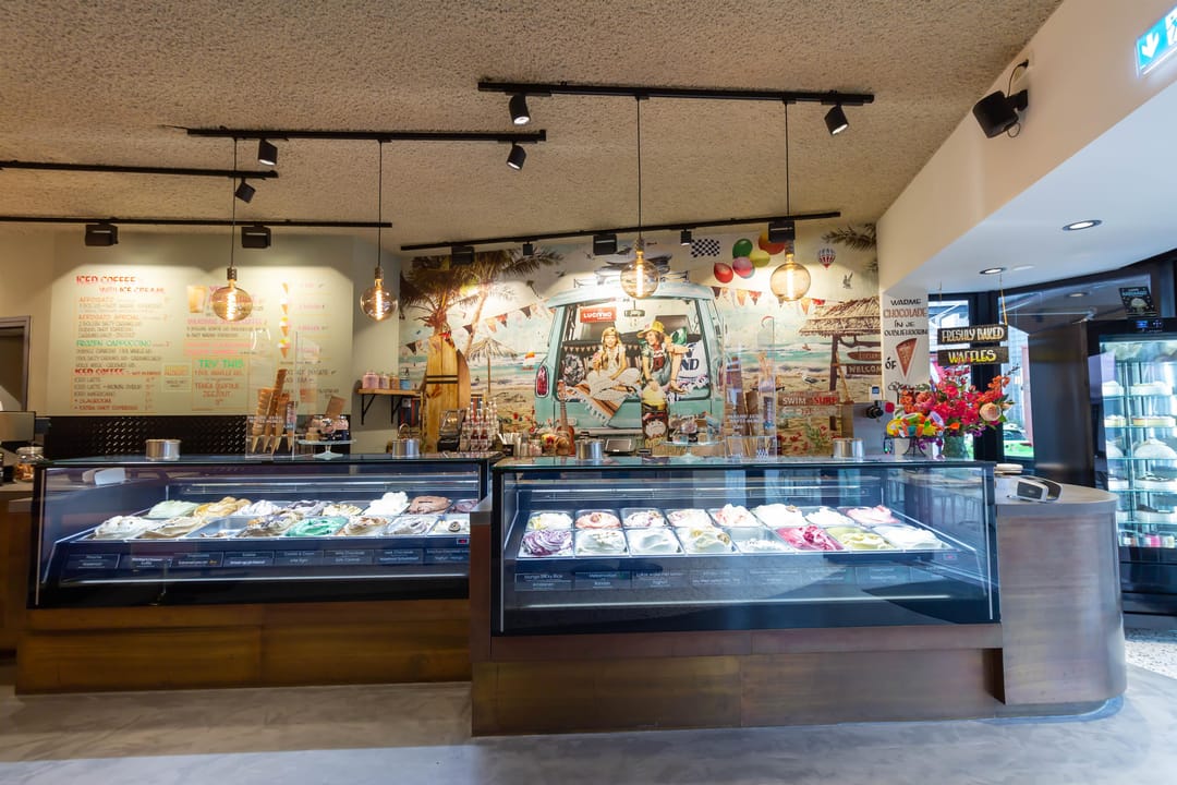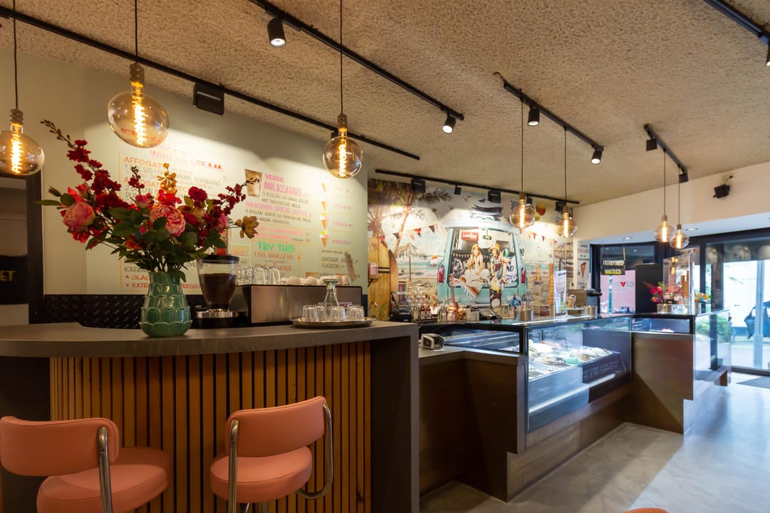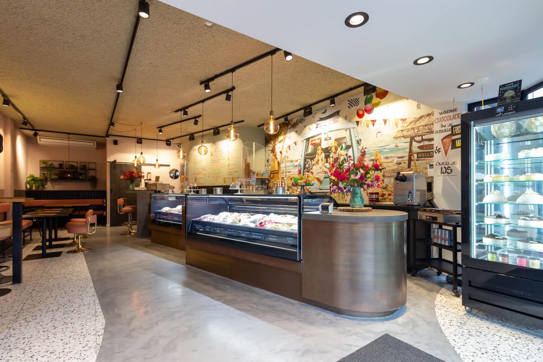 De ijssalon beschikt over een schuifwand aan de voorzijde, waardoor de winkel volledig geopend kan worden en een open, uitnodigende sfeer creëert. Bij binnenkomst wordt men direct verwelkomd in de verkoopruimte, waar de hoogwaardige ijsvitrine aan de rechterzijde onmiddellijk de aandacht trekt. Deze prachtige ijsvitrine zorgt voor een optimale presentatie van het assortiment. Een vitrine vol verleidelijke kleuren en smaken, uitnodigend voor elke bezoeker. Aan het einde van de vitrine bevindt zich de espressobar met zitplaatsen waar gasten kunnen genieten van verse koffie.