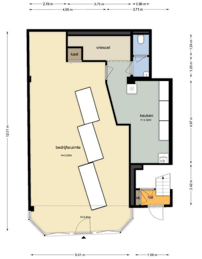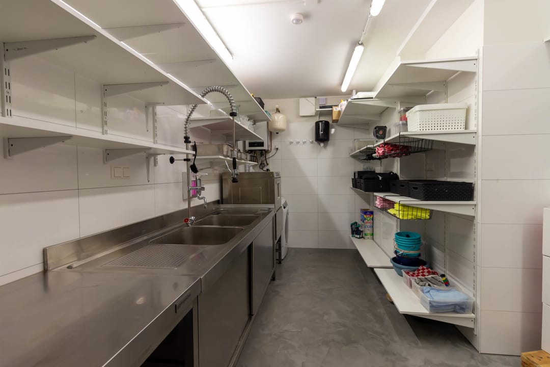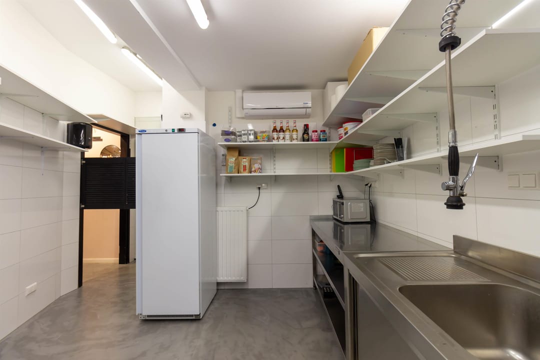 Achter de toonbank is via een klapdeur de dienstenruimte te bereiken met een toilet, vriescel en de spoelkeuken. Dekeukenisvoorzien van horeca- inventaris, waaronder een koelkast, RVS werkbank, spoelbak en vaatwasser. Daarnaast dient deze ruimte als opslagruimte. De achtergelegen ruimte is ca. 20 m² groot. De totale bedrijfsruimte is ca. 87 m²