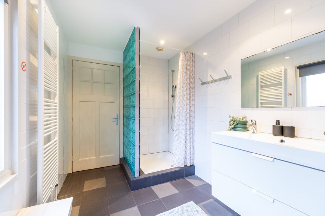 DE BADKAMER (ca. 2,8 x 2,0 mtr) is voorzien van een inloopdouche, wastafel met meubel, designradiator en deur naar de wasruimte.