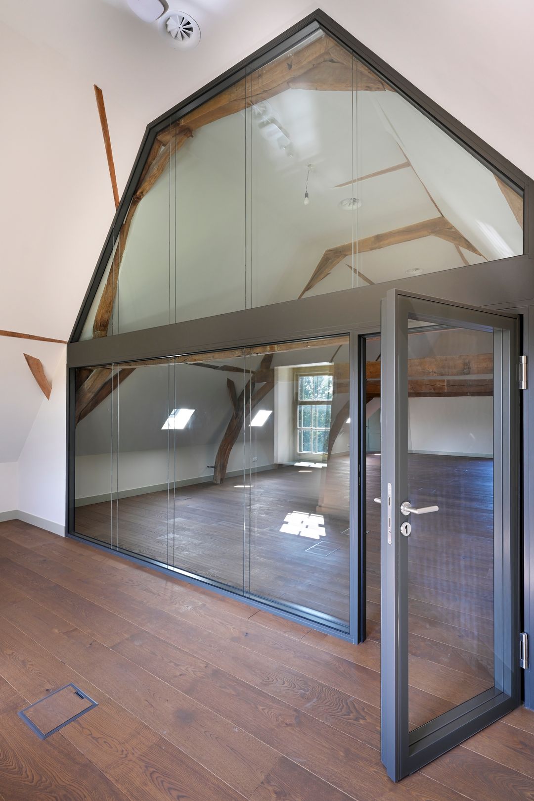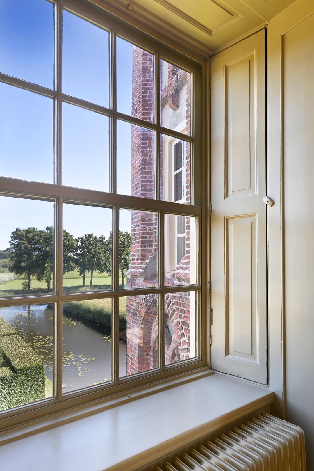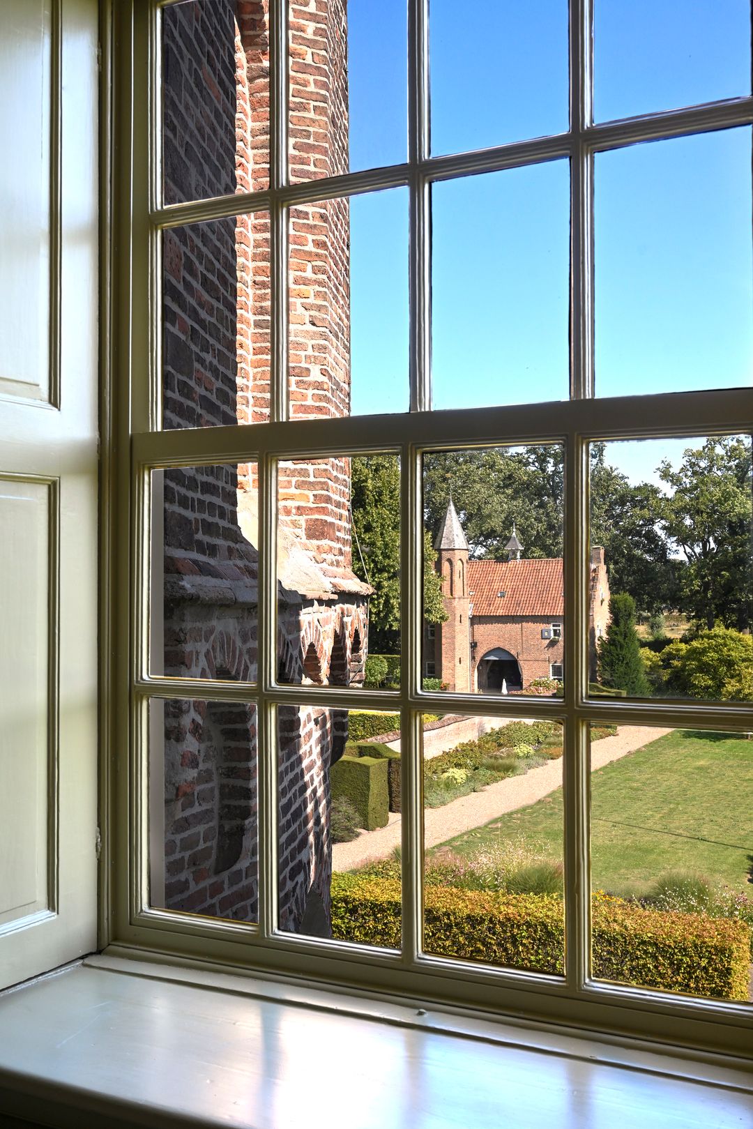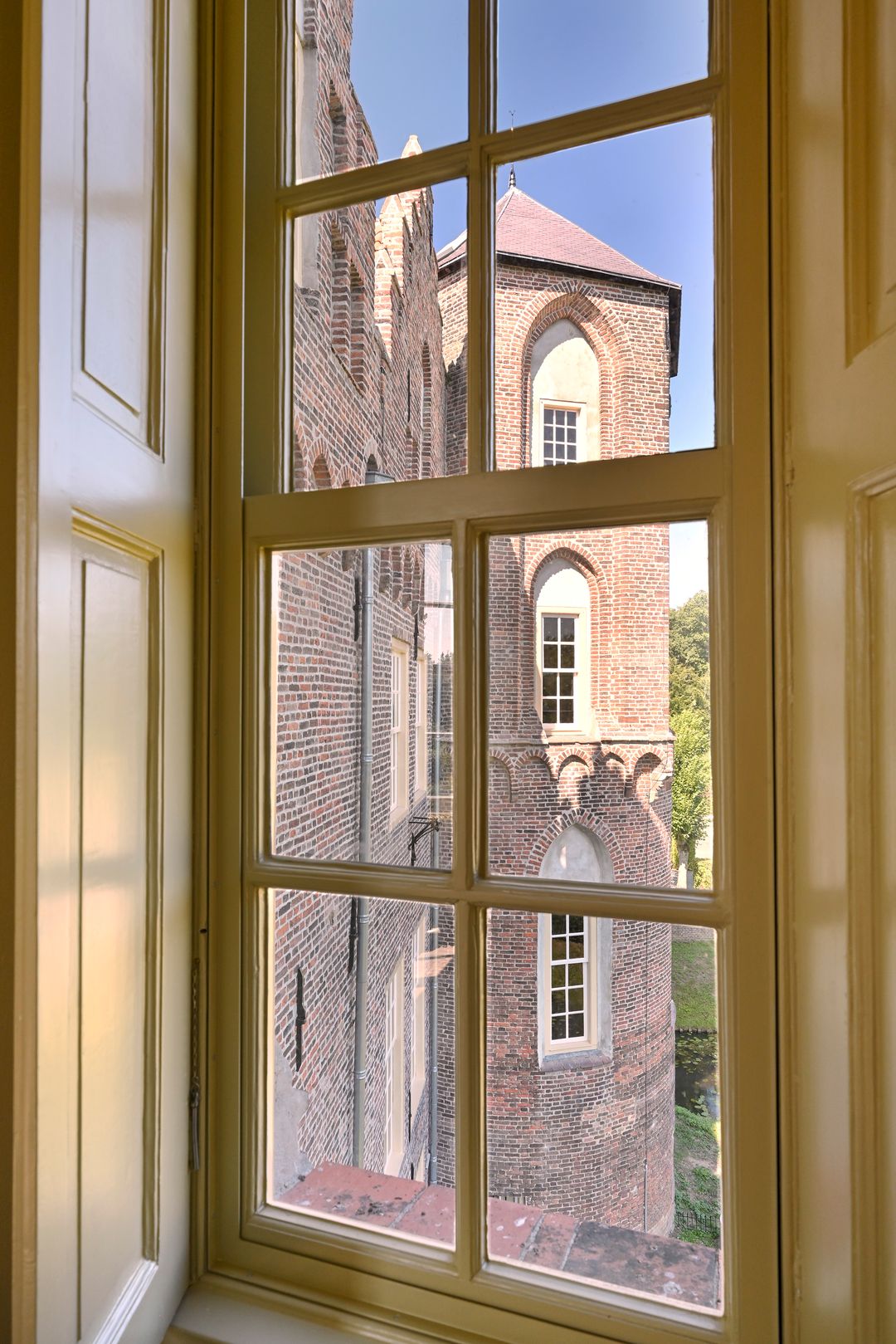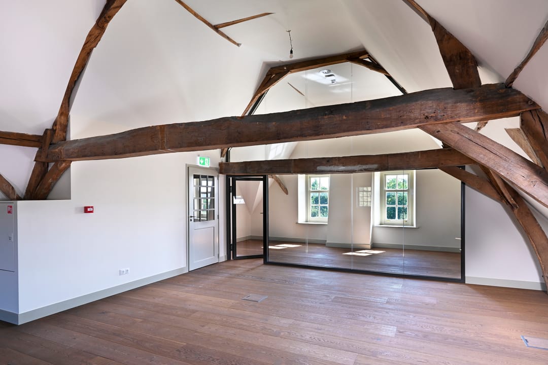 De eerste en tweede (zolder-)etage zijn tijdens de renovatie zeer grondig aangepakt en deels heringedeeld. Elke etage beschikt nu over eigen gescheiden sanitaire groepen en een pantryvoorziening. Hierdoor zijn 2 efficiënte, grotendeels open kantooretages ontstaan. Er is sprake van een mooi contrast tussen de historische elementen van het kasteel en de moderne elementen die passen bij de hedendaagse kantoorwerkvloer.