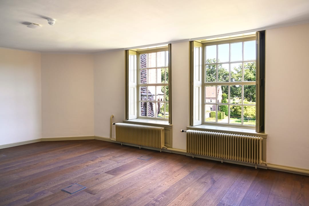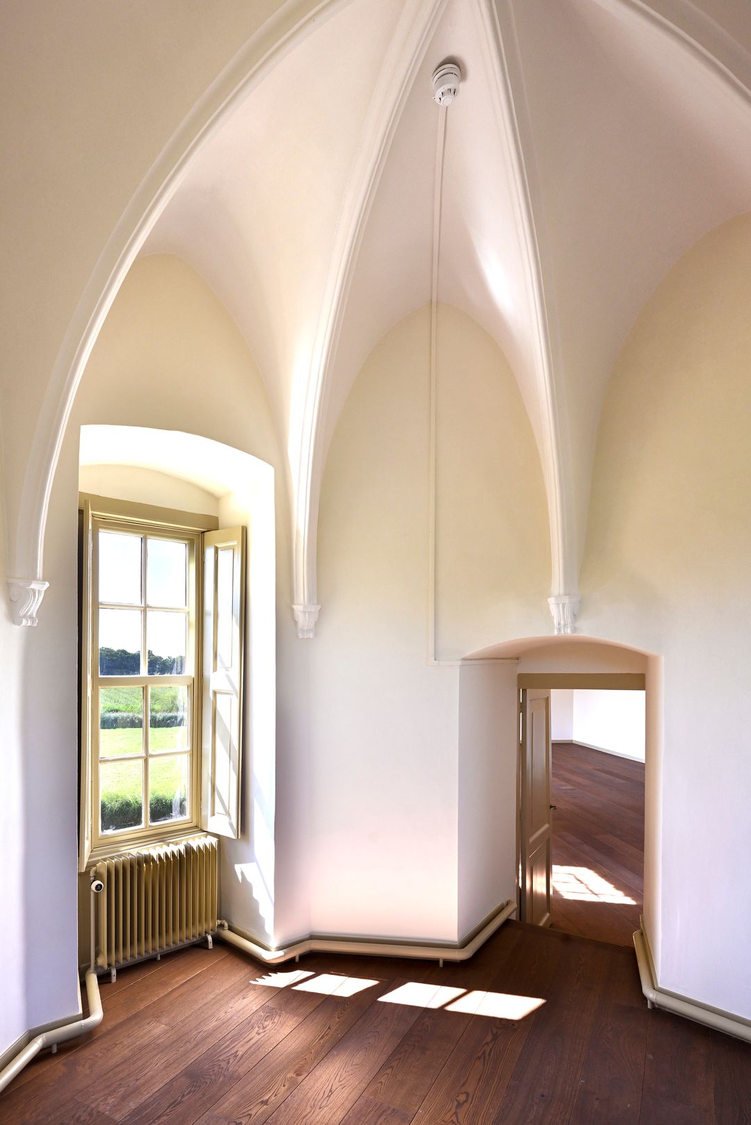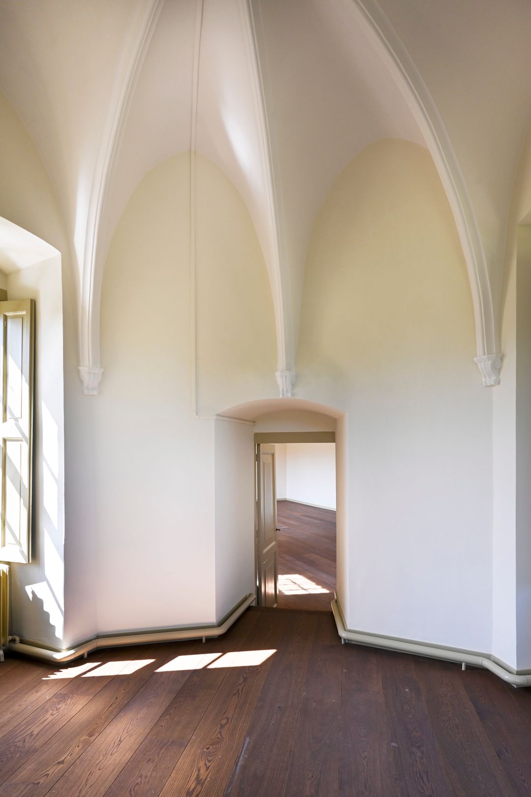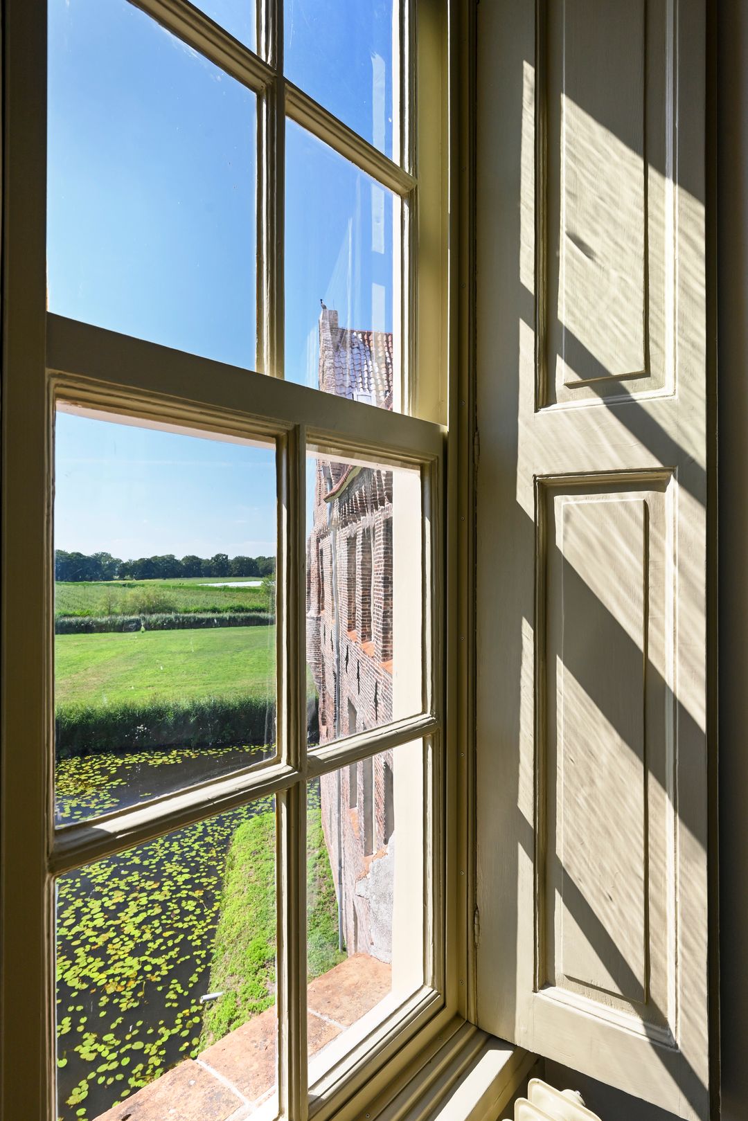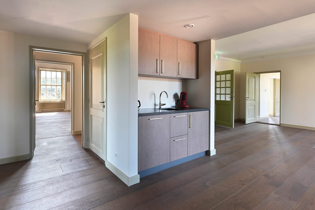 De eerste en tweede (zolder-)etage zijn tijdens de renovatie zeer grondig aangepakt en deels heringedeeld. Elke etage beschikt nu over eigen gescheiden sanitaire groepen en een pantryvoorziening. Hierdoor zijn 2 efficiënte, grotendeels open kantooretages ontstaan. Er is sprake van een mooi contrast tussen de historische elementen van het kasteel en de moderne elementen die passen bij de hedendaagse kantoorwerkvloer.