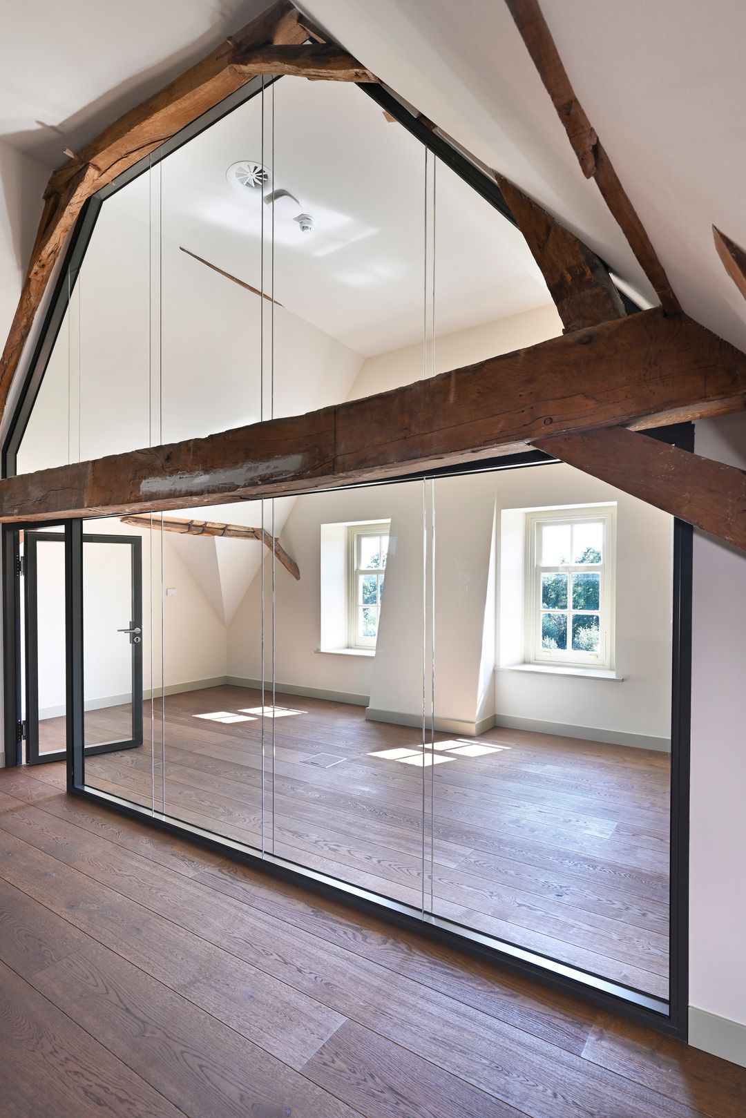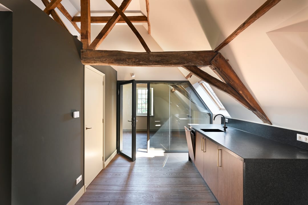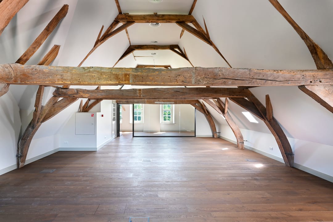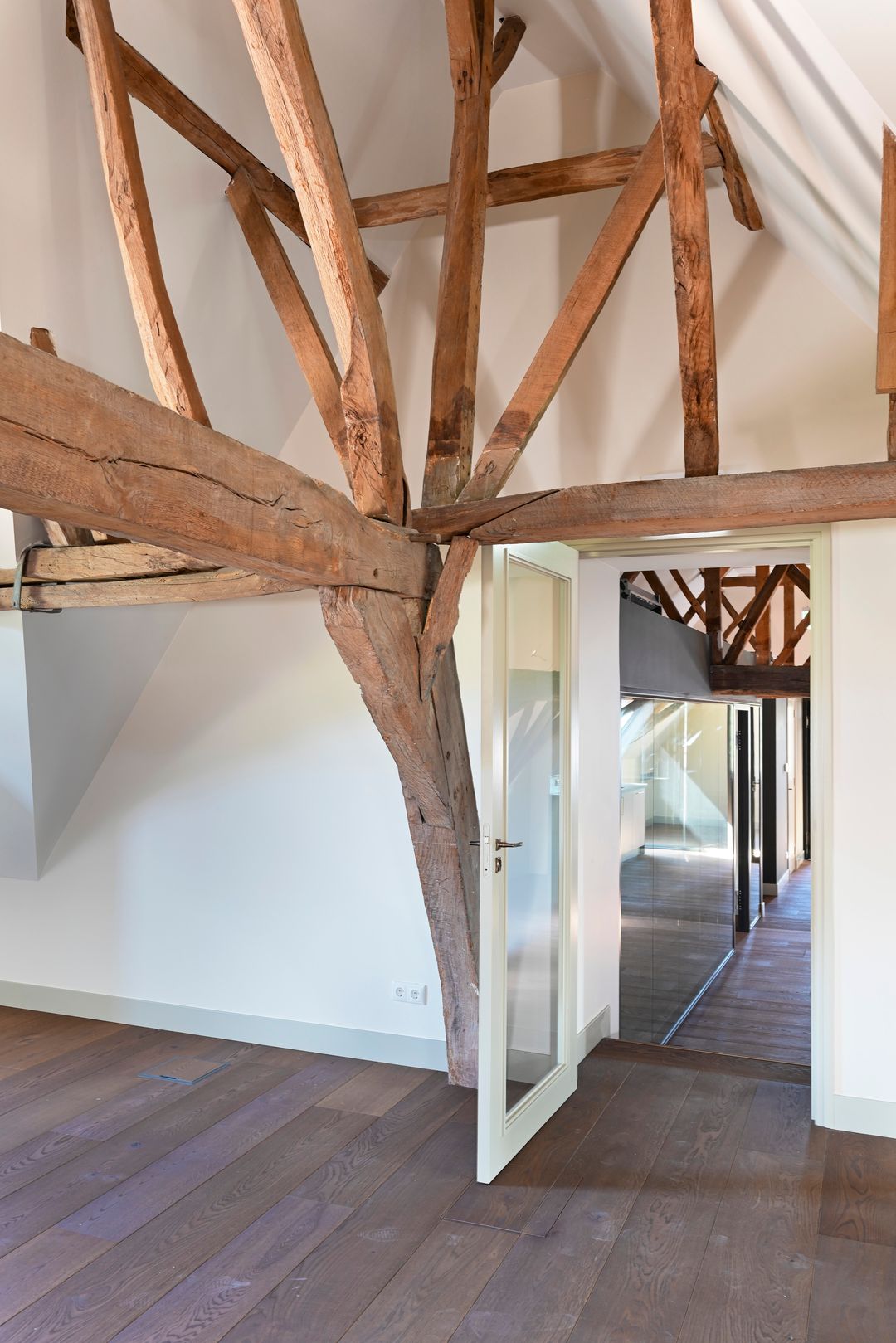• hoge plafonds op de 1e etage en schuine dakvlakken met fraaie houten spanten in zicht op de tweede (zolder-)etage