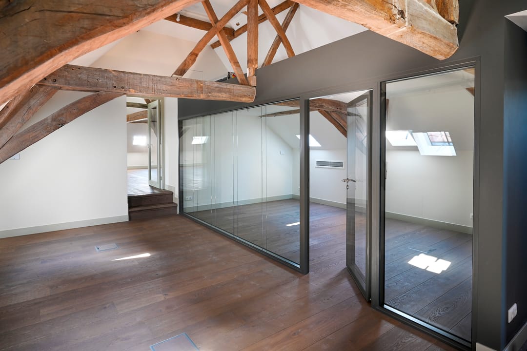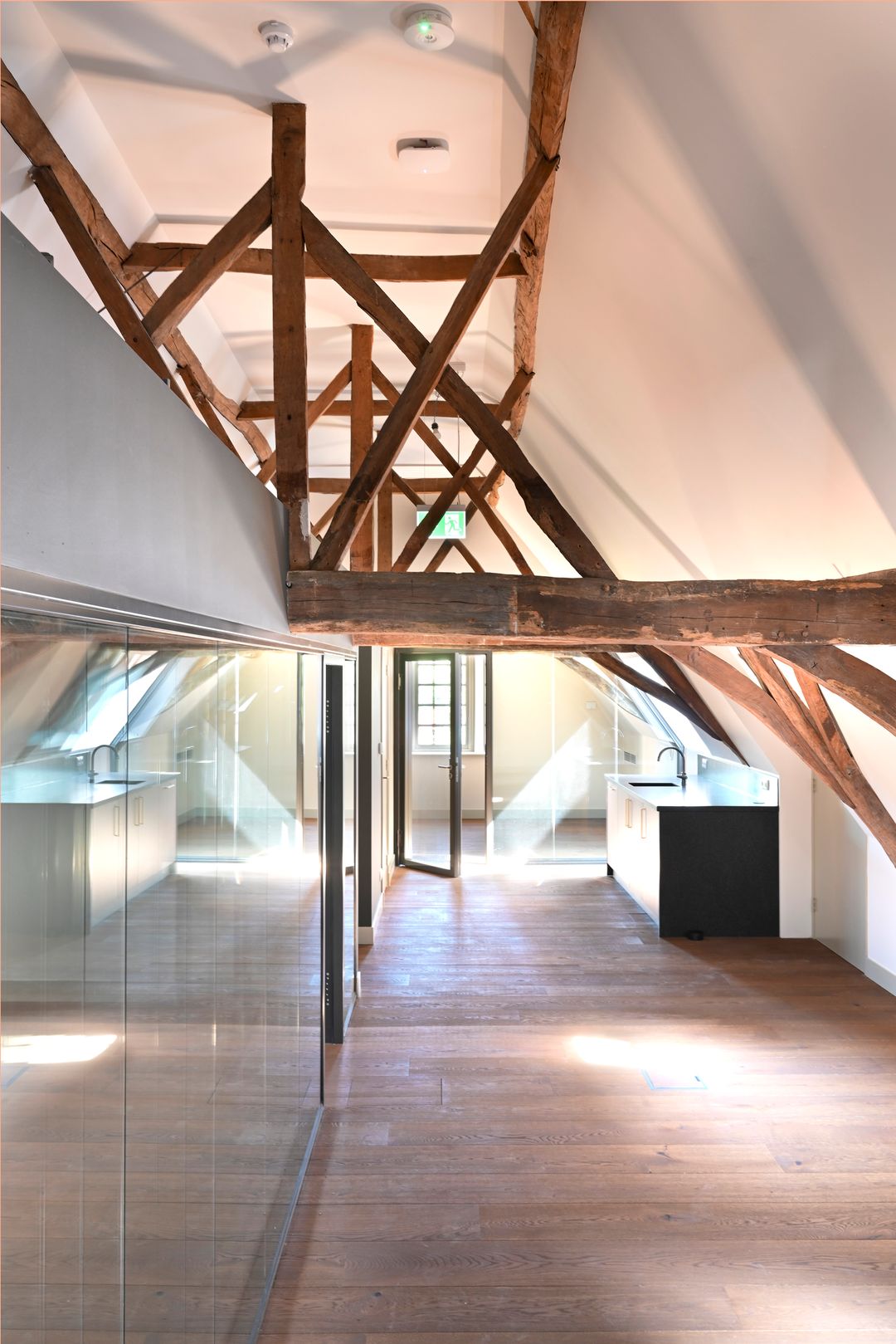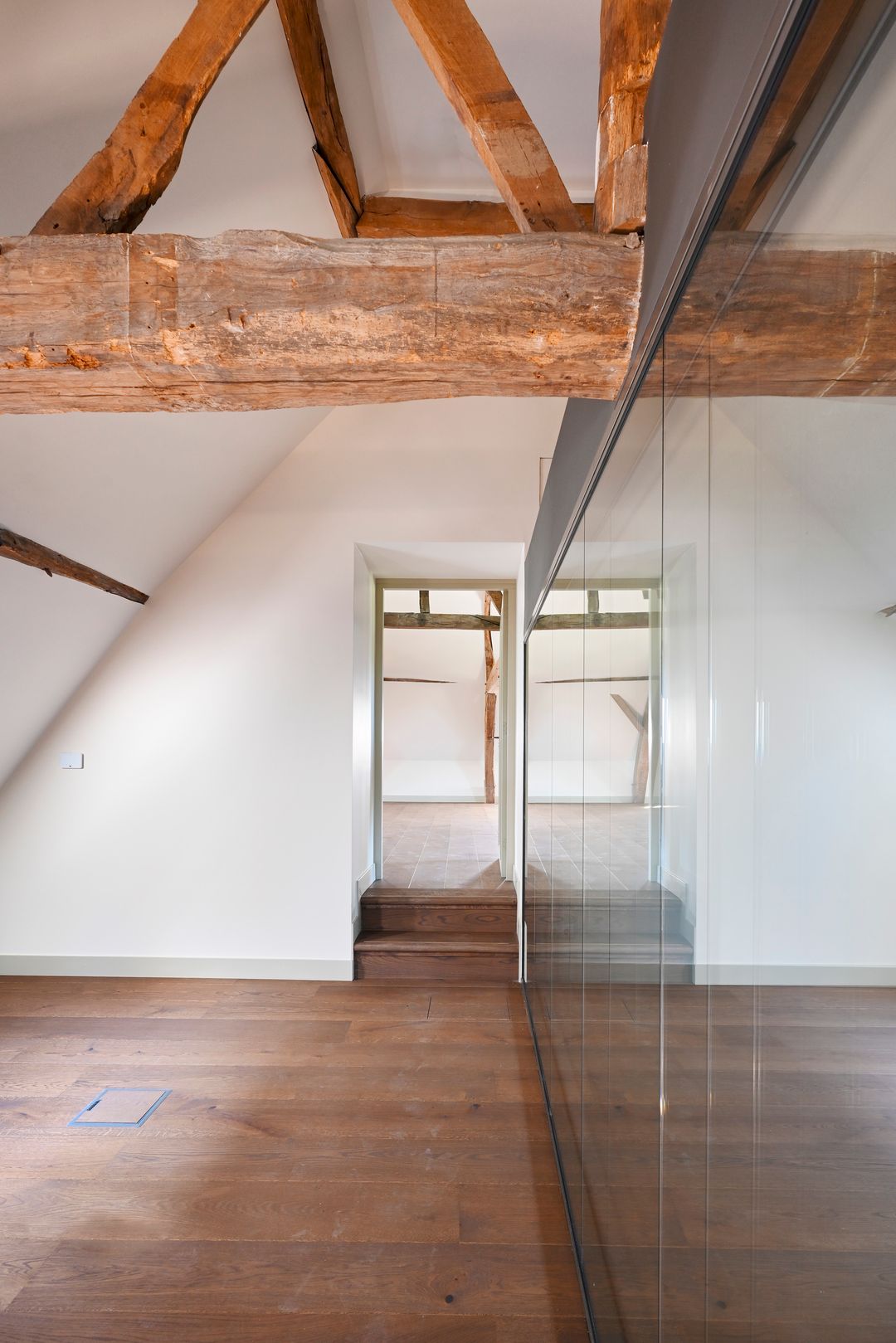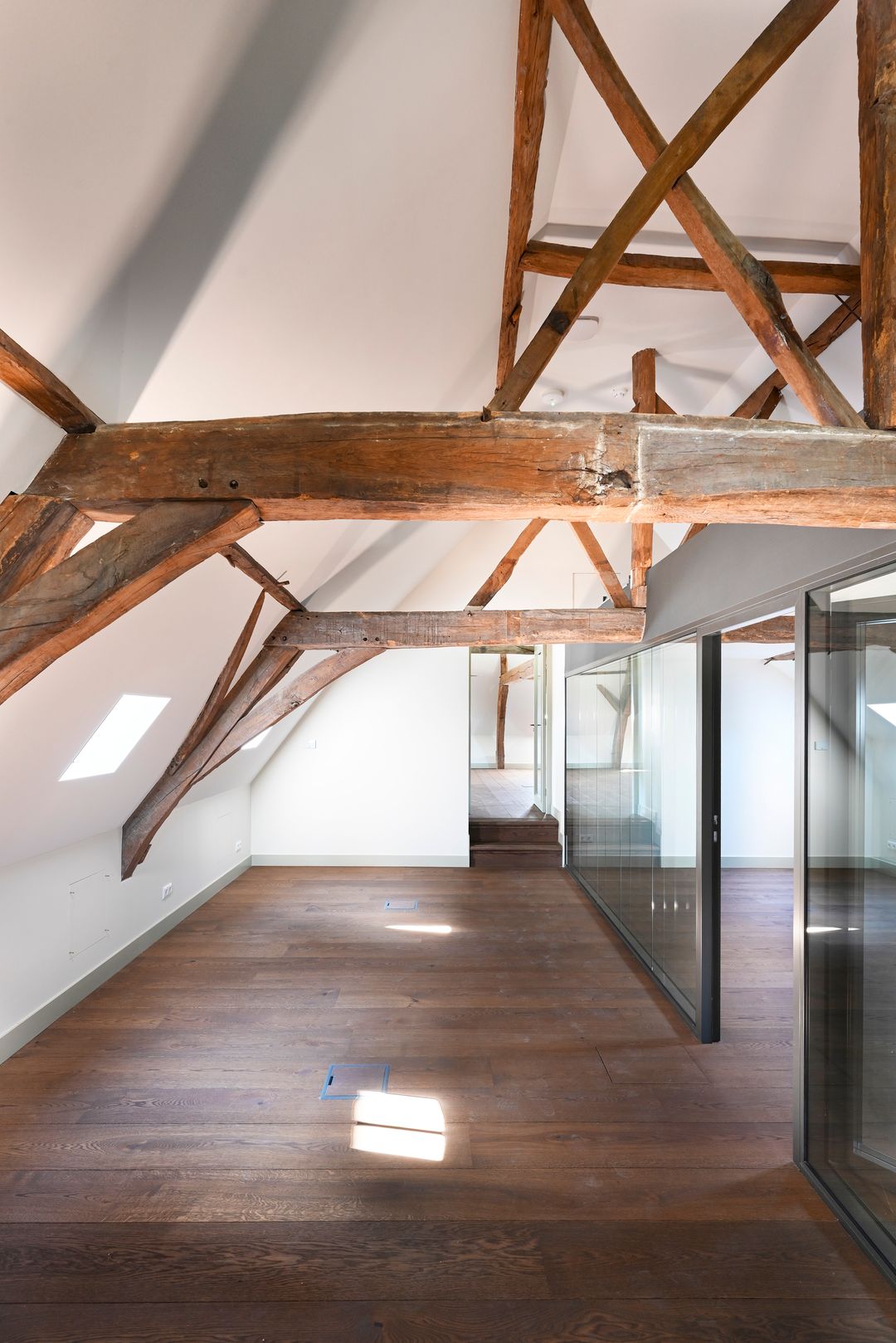 • hoge plafonds op de 1e etage en schuine dakvlakken met fraaie houten spanten in zicht op de tweede (zolder-)etage