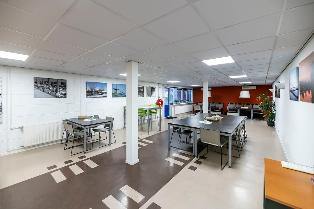 - kantine voorzien van linoleum vloer en keuken met vaatwasser en magnetron;