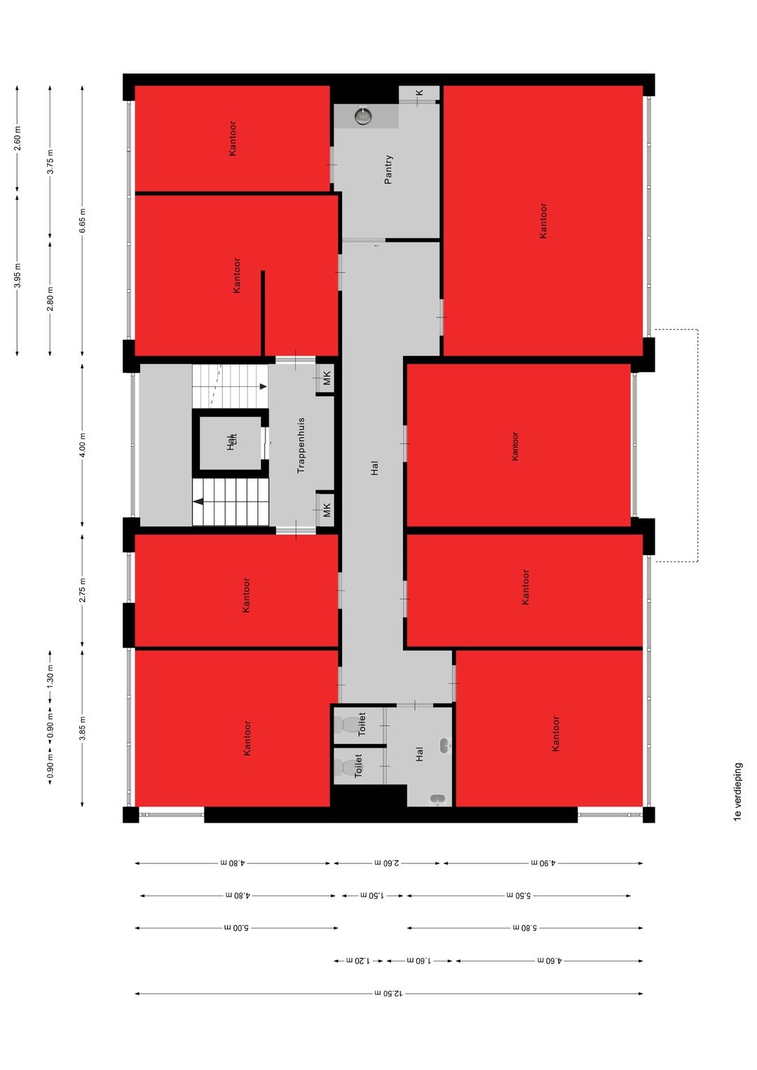 Entree, vanuit de centrale hal, middels de lift en trap naar de kantoorruimte. De kantoorruimte heeft een kamerindeling. Voor de afmetingen van de indeling van de kamers wordt verwezen naar de plattegrond. De berging bevindt zich in de kelder.