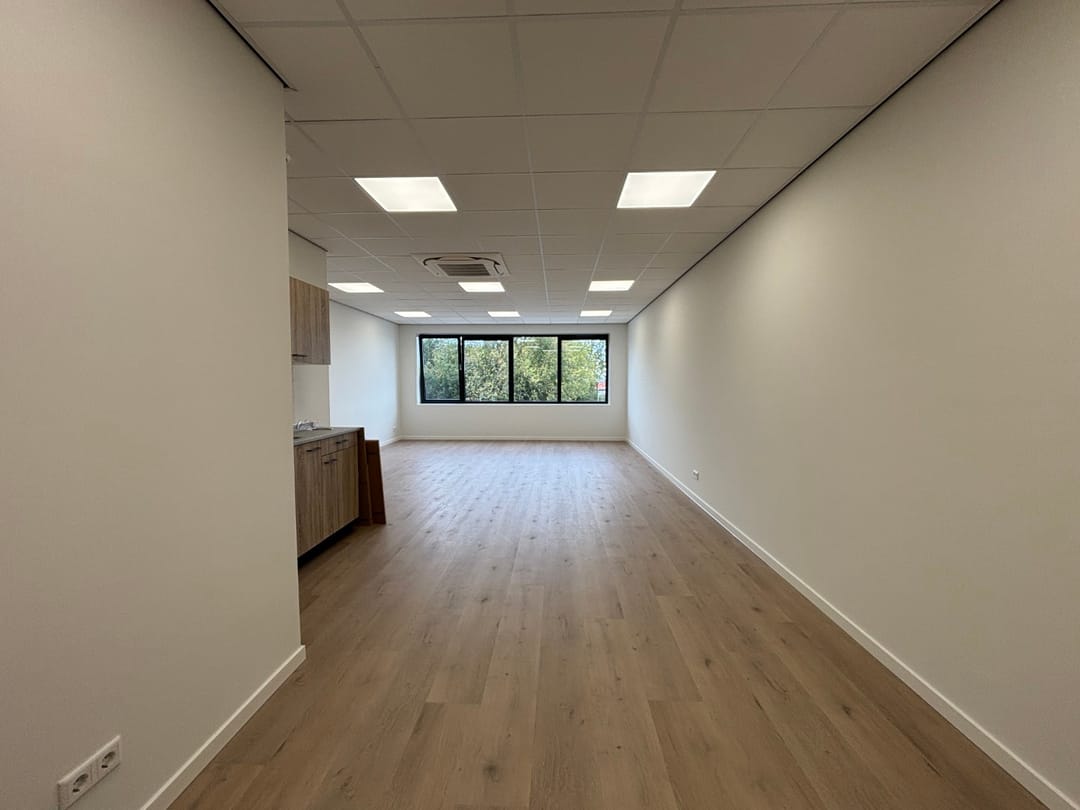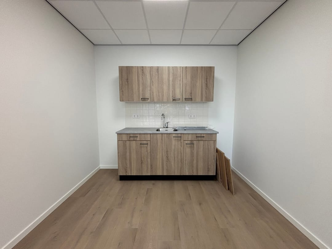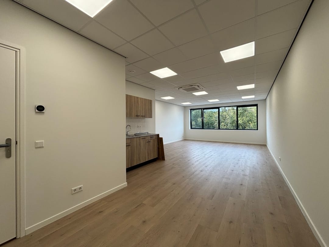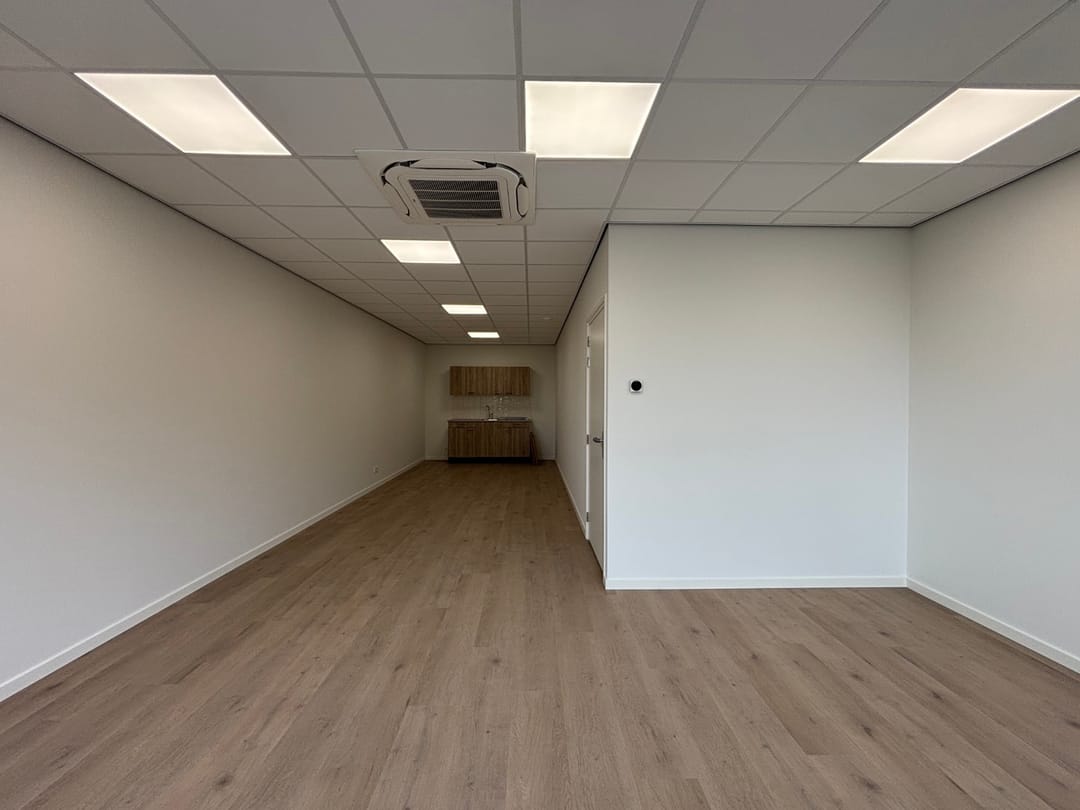 pvc-vloer, elektra en watervoorziening, systeemplafond met verlichtingsarmaturen, wandcontactdozen, airco/verwarmingsunit, pantry en toilet.