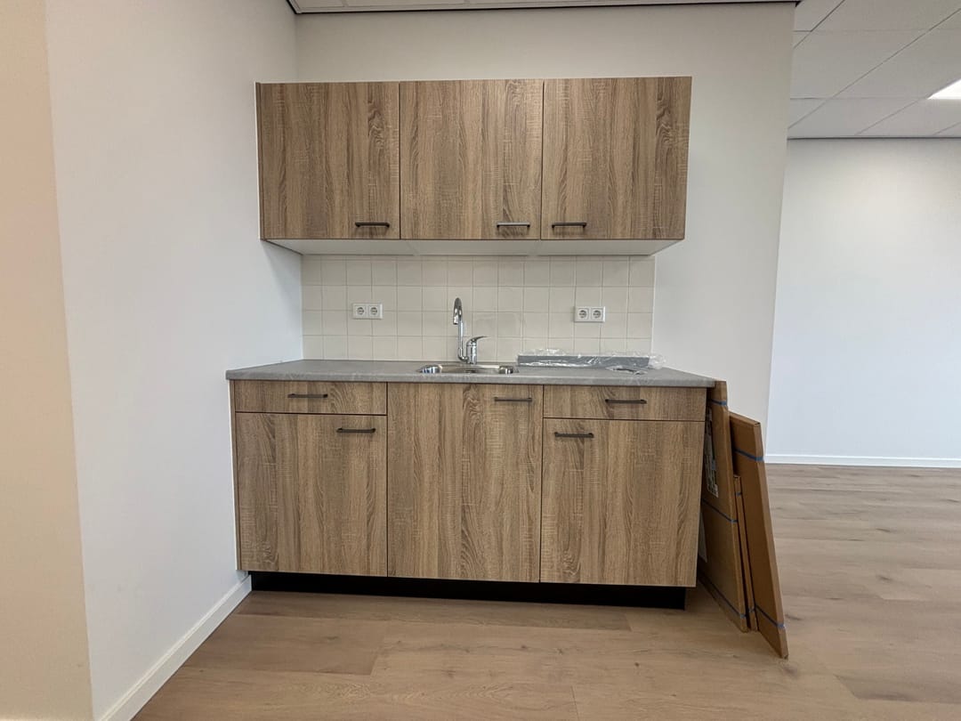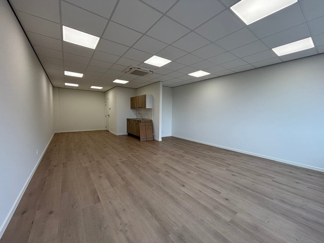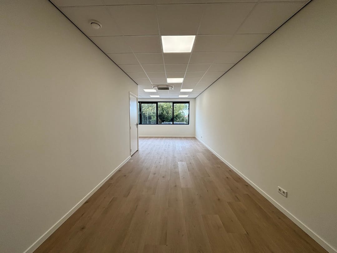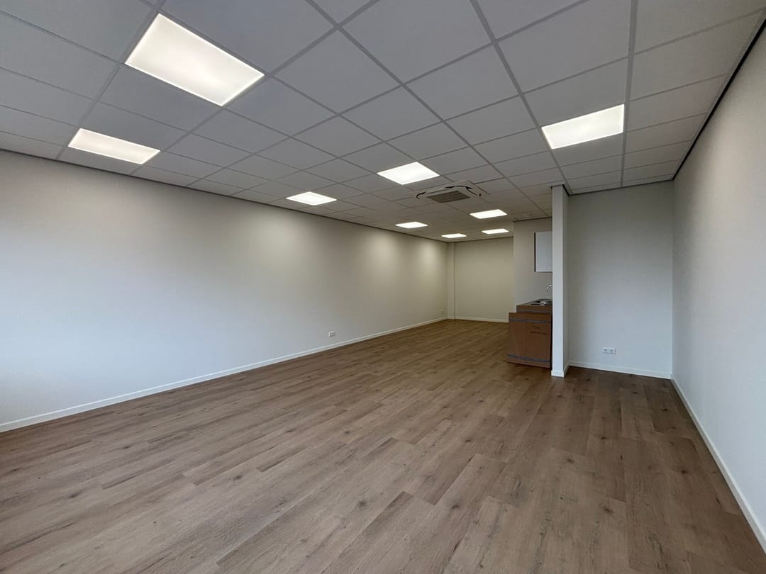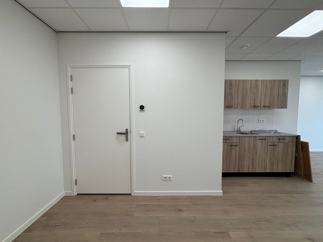 pvc-vloer, elektra en watervoorziening, systeemplafond met verlichtingsarmaturen, wandcontactdozen, airco/verwarmingsunit, pantry en toilet.