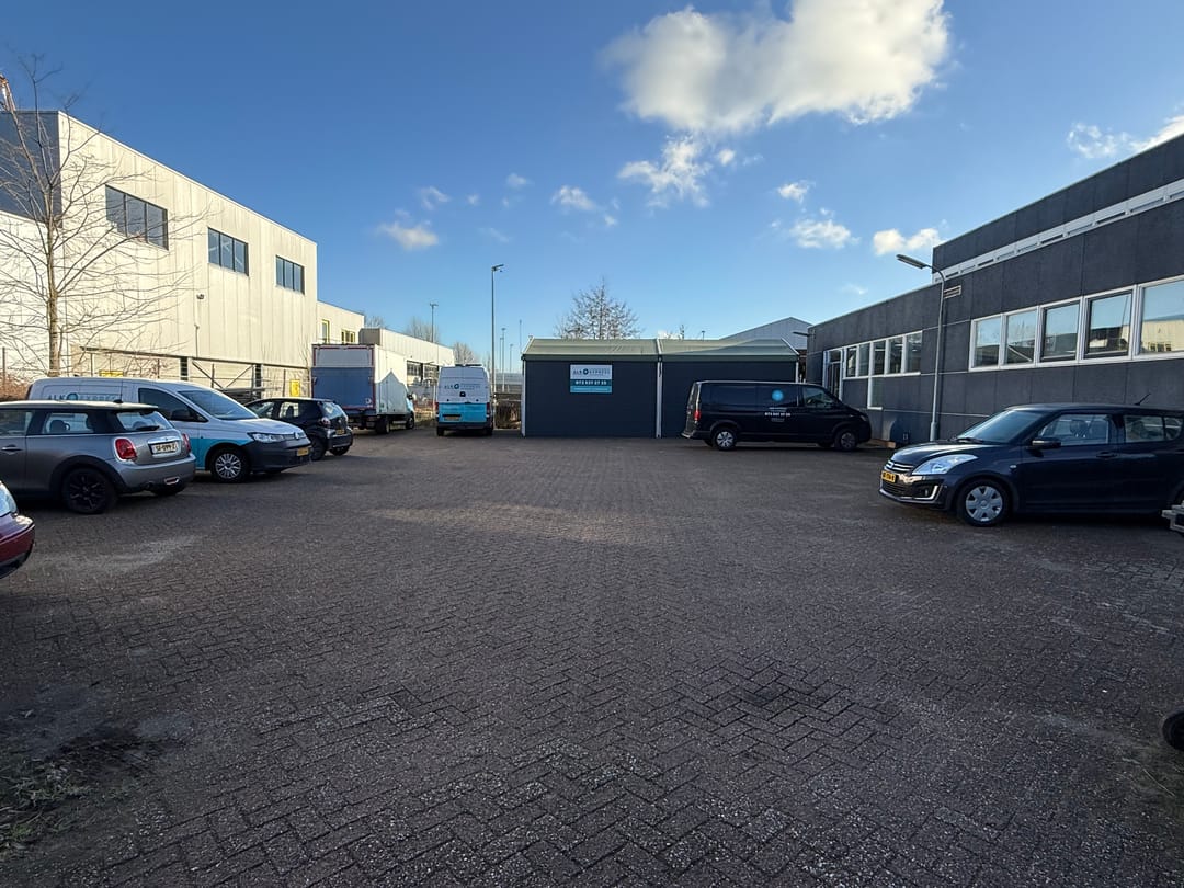 Aan de achterzijde van het gebouw ligt het bijbehorende royale parkeerterrein, welke plaats biedt voor ca. 21 personenauto's, gezamenlijk voor alle gebruikers.