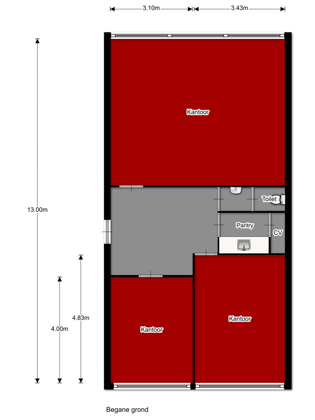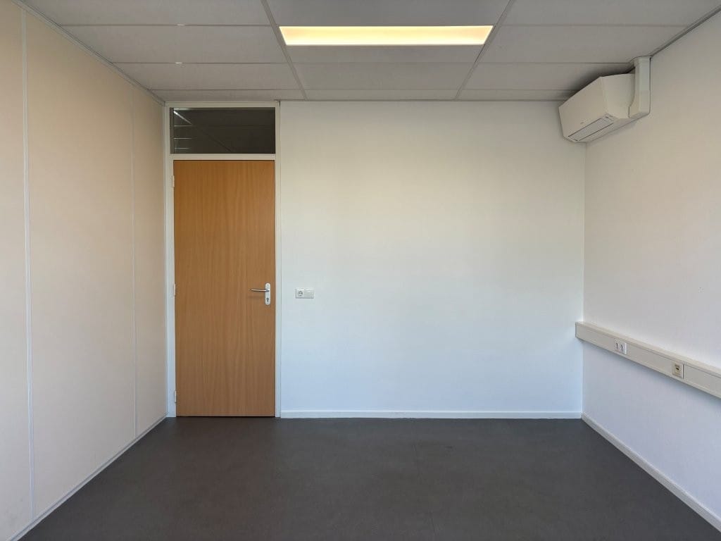 De entree bevindt zich op de begane grond en is toegankelijk via de gemeenschappelijke entree. De toegang tot de kantoorruimte bevindt zich aan de rechterzijde van deze entree. Aan de voorzijde van de kantoorruimte liggen de twee kantoor-/spreekkamers. In het midden van de kantoorunit bevinden zich een afgewerkte toiletruimte en pantry. Aan de achterzijde van de kantoorruimte is een grote kantoortuin gelegen.