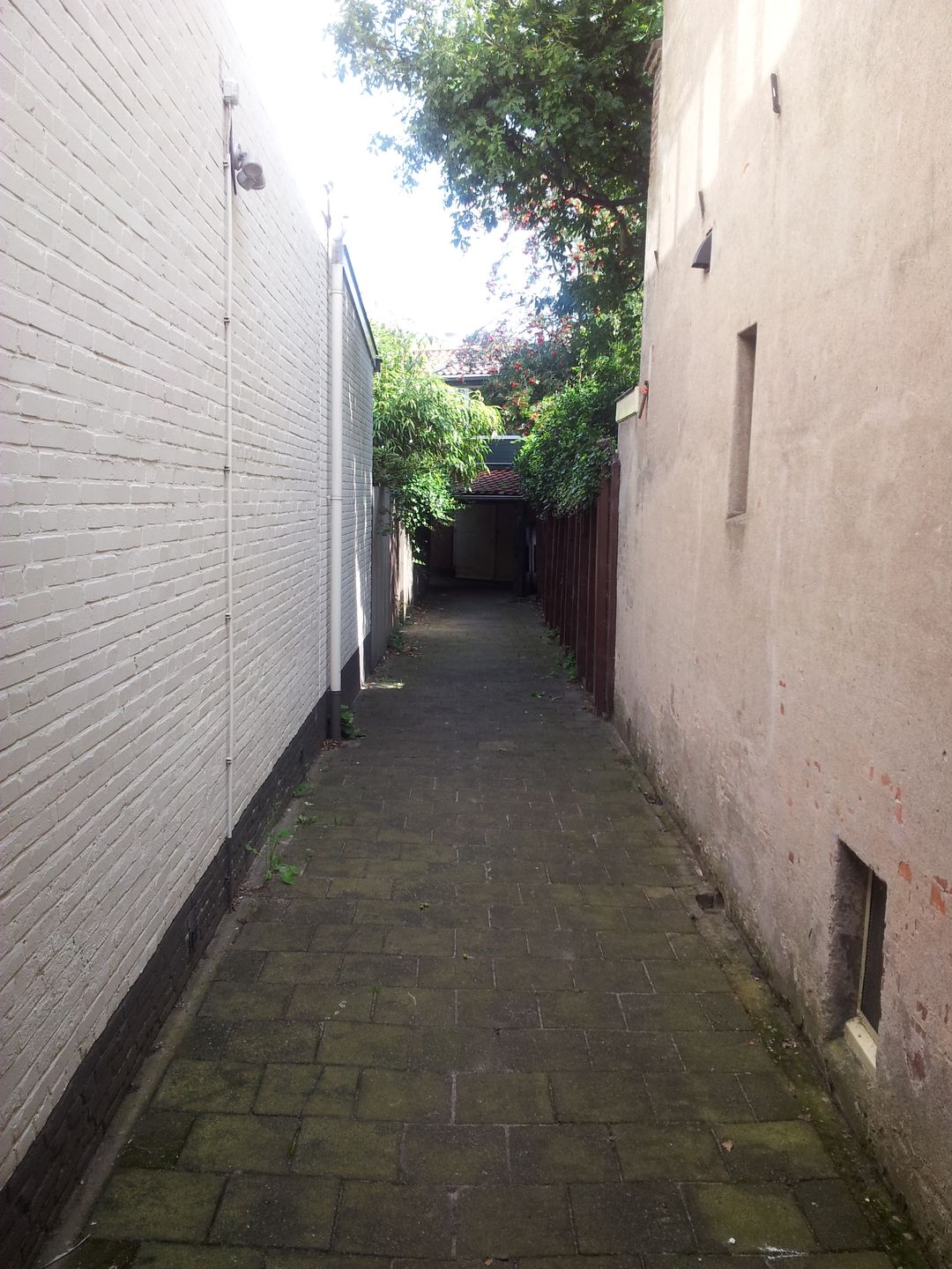 Vanaf de openbare weg is er toegang via een dichte houten poort met intercom (aanwezig op de begane grond en op de verdieping.). De hierachter gelegen toegangssteeg is verhard merendeels met eenvoudige betontegels en is deels voor eigen gebruik. Fietsen kunnen hier gestald worden.De buren gebruiken de steeg ter ontsluiting van hun achtererf.