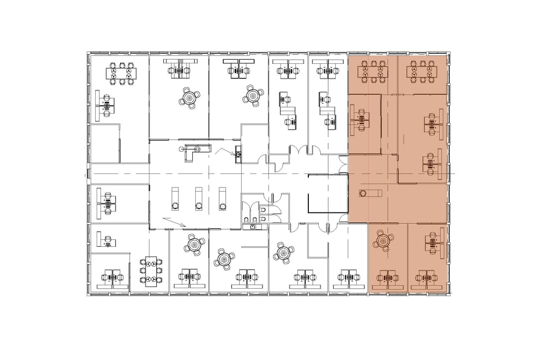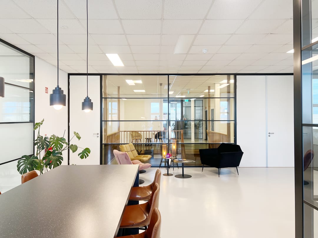 Van de vier kantoren zijn twee kantoren aan de noordwestzijde voorzien van glazen scheidingswanden, waardoor deze ook geschikt zijn als separate werk- en bespreekruimte. De oppervlaktes van deze twee ruimtes zijn 72 en 55 m². De twee kantoren aan de noordoostzijde hebben elk een oppervlakte van 30 m².