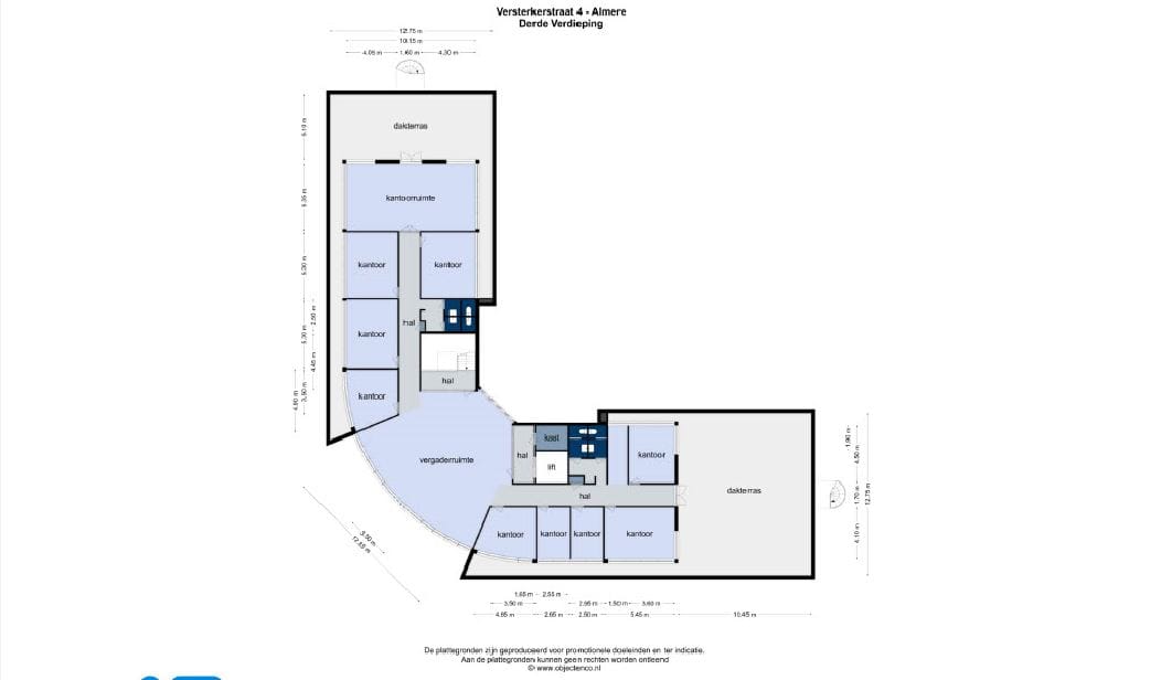 De te huren kantoorruimte bevindt zich op de 3e verdieping en heeft een totale oppervlakte van circa 434 m². De ruimte biedt toegang tot een dakterras.