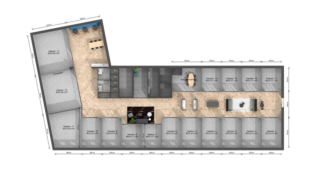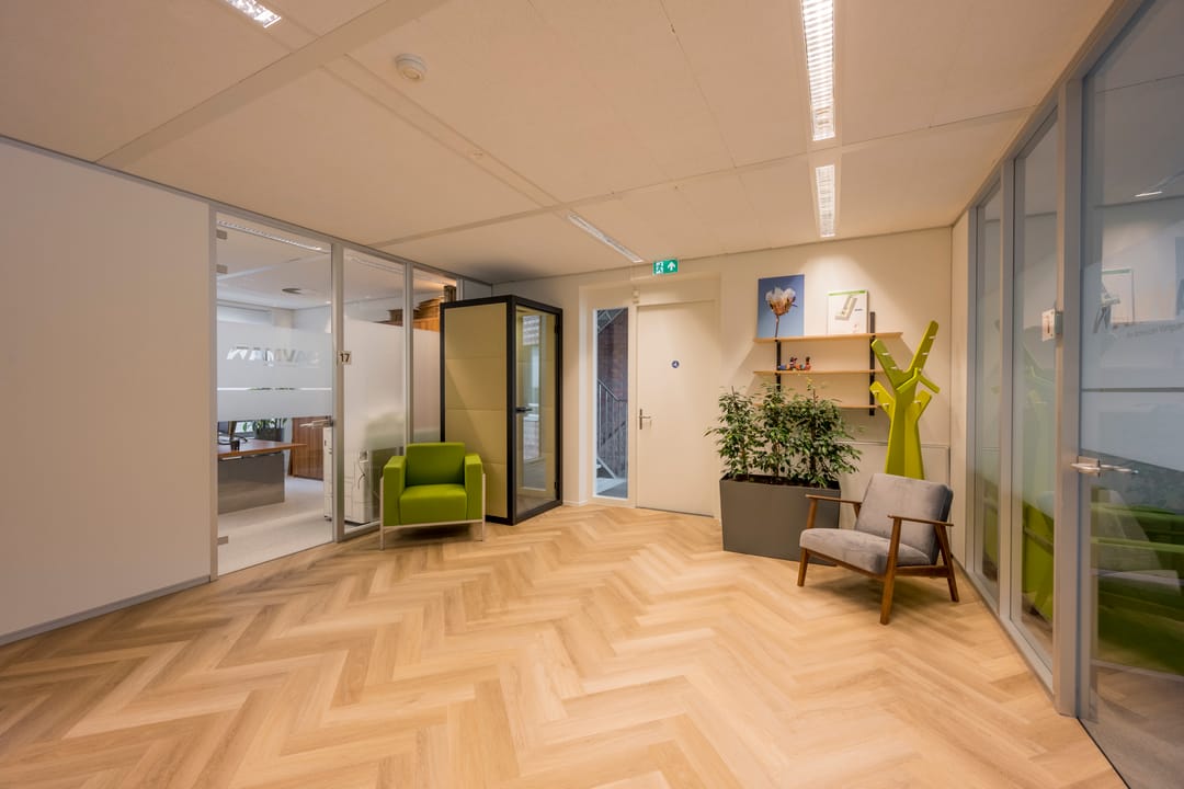 - Ingerichte shared ruimtes zoals > ontvangstruimte, loungeruimte, zitje, borrelruimte, vergaderruimte, akoestische bel-cel, pantry en koffiebar