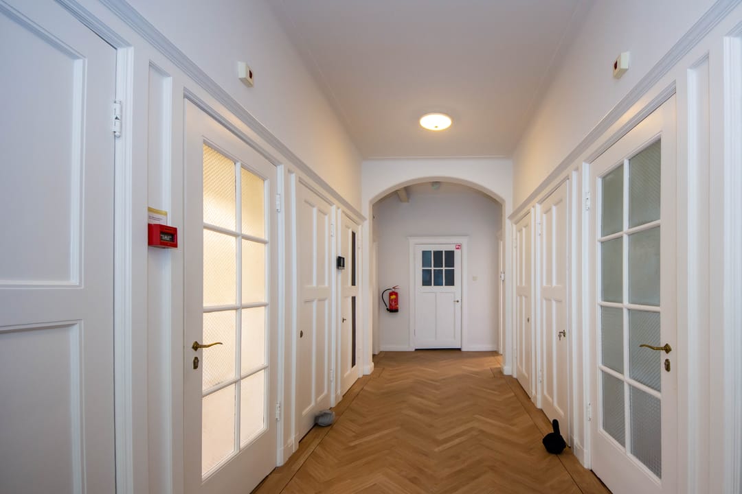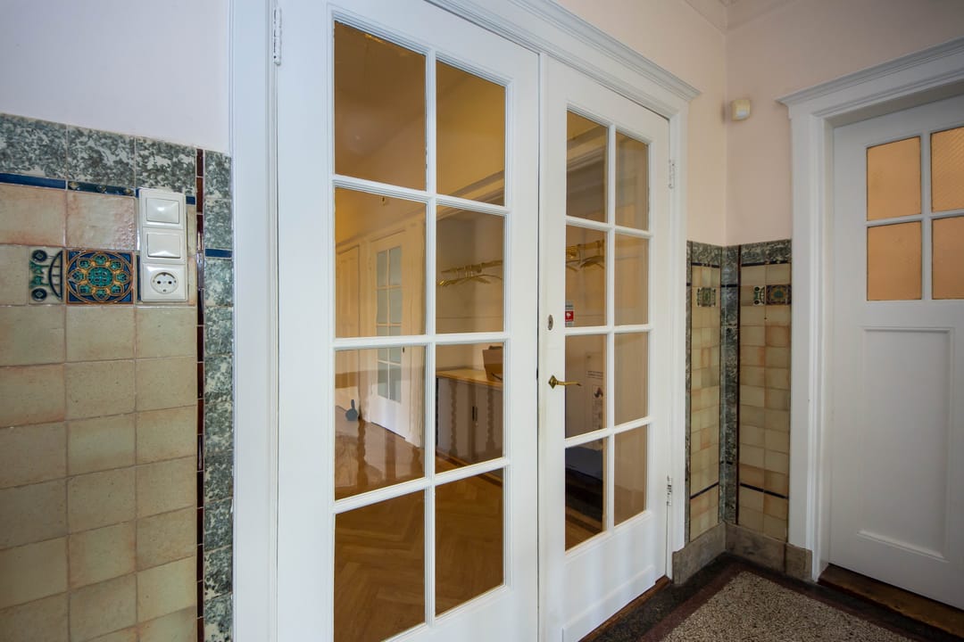 De kantoorvilla bestaat uit de hoofdwoning en het souterrain (waar Comma Vastgoed al jaren is gevestigd), beiden met een eigen entree. Via de hoofdentree komt u in de royale hal, met toegang tot het bijzondere trappenhuis dat volledig in authentieke staat verkeert. De hal en het trappenhuis zijn rijk gedecoreerd met oosterse motieven, gestileerde tegels en glas-in-loodramen. Op de tweede verdieping bevindt zich de beschikbare kantoorruimte.