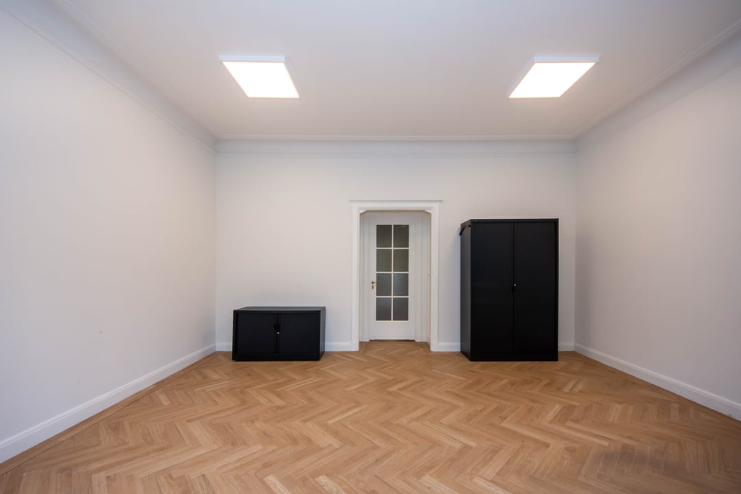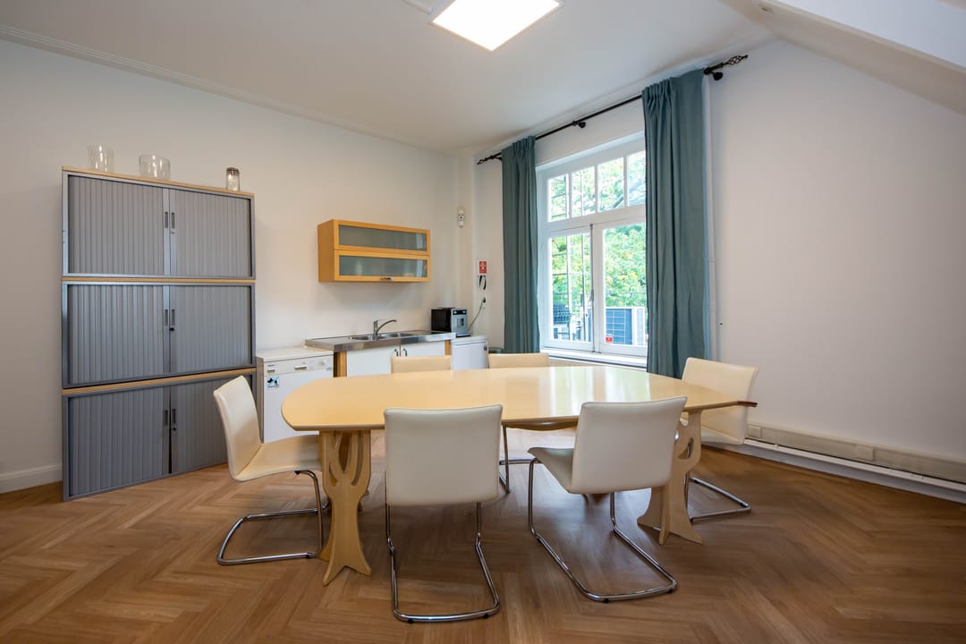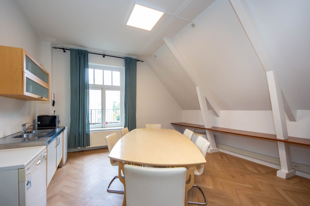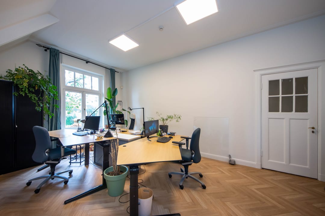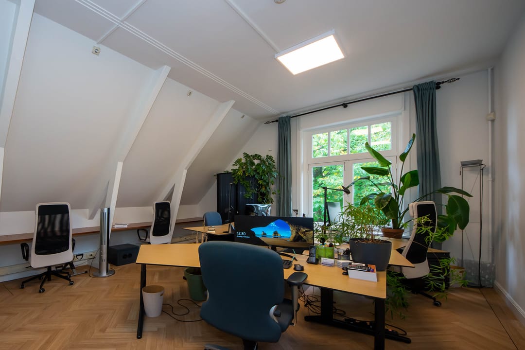 De kantoorverdieping beschikt over vier ruime kantoorkamers die uitkijken op het groen.
