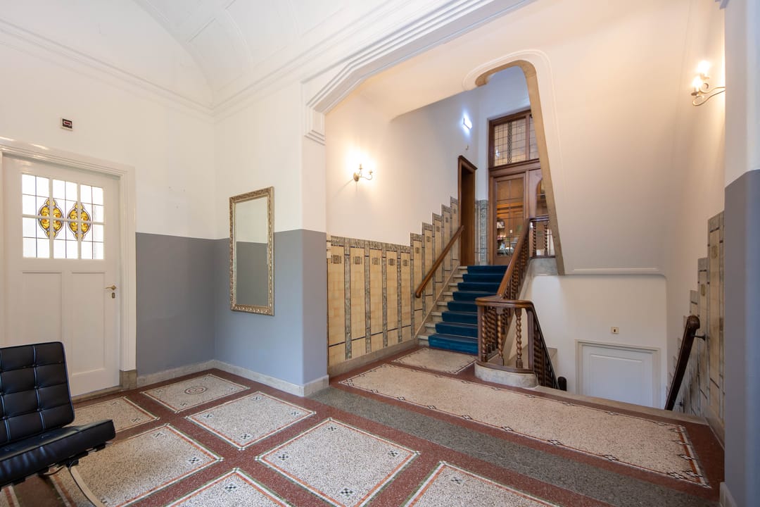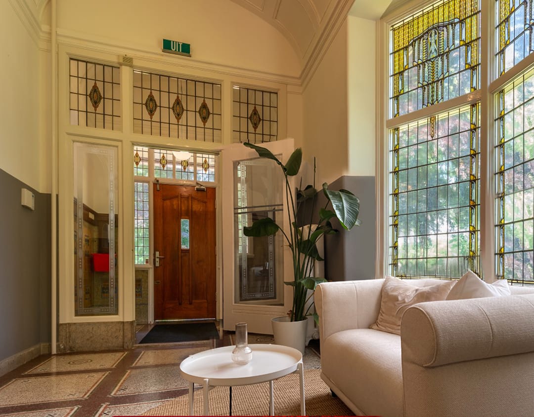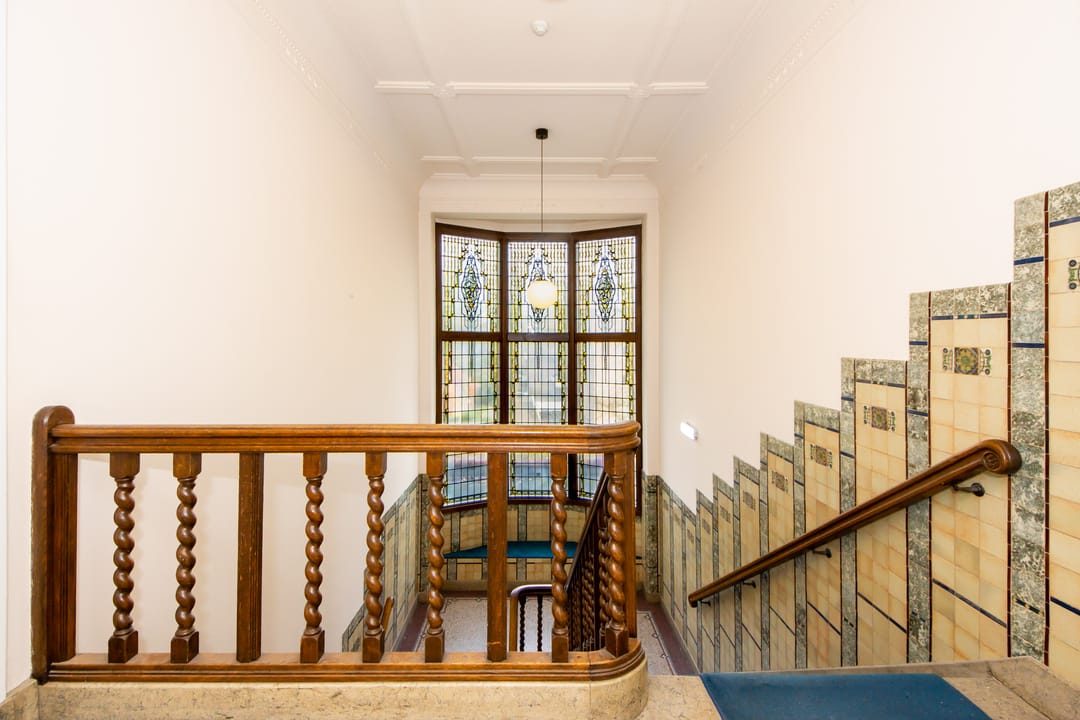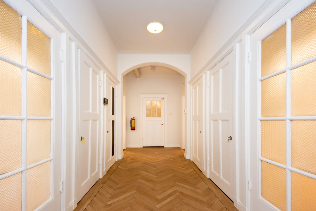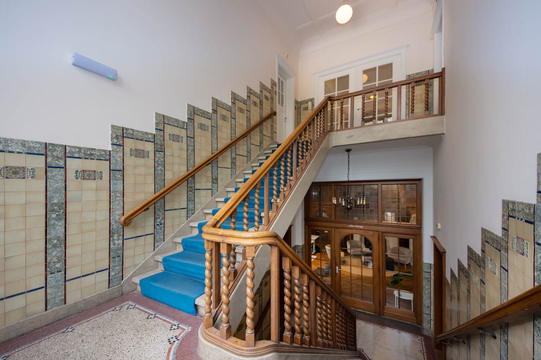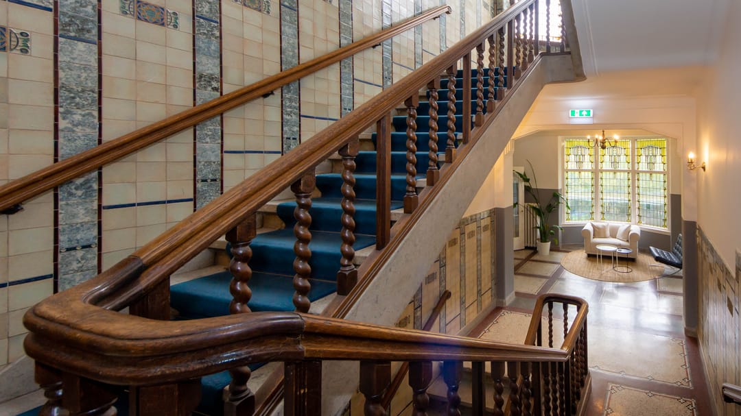 De kantoorvilla bestaat uit de hoofdwoning en het souterrain (waar Comma Vastgoed al jaren is gevestigd), beiden met een eigen entree. Via de hoofdentree komt u in de royale hal, met toegang tot het bijzondere trappenhuis dat volledig in authentieke staat verkeert. De hal en het trappenhuis zijn rijk gedecoreerd met oosterse motieven, gestileerde tegels en glas-in-loodramen. Op de tweede verdieping bevindt zich de beschikbare kantoorruimte.