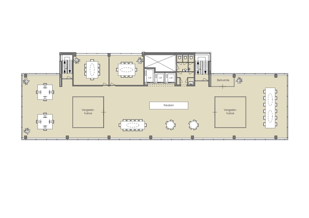 Het huidige opleveringsniveau en inbouwpakket verschilt per verdieping maar zal door verhuurder volledig turn-key worden gemaakt, in overleg en naar wens van een nieuwe huurder. Ter impressie zijn renders gemaakt naar ontwerp van Firm Architects.