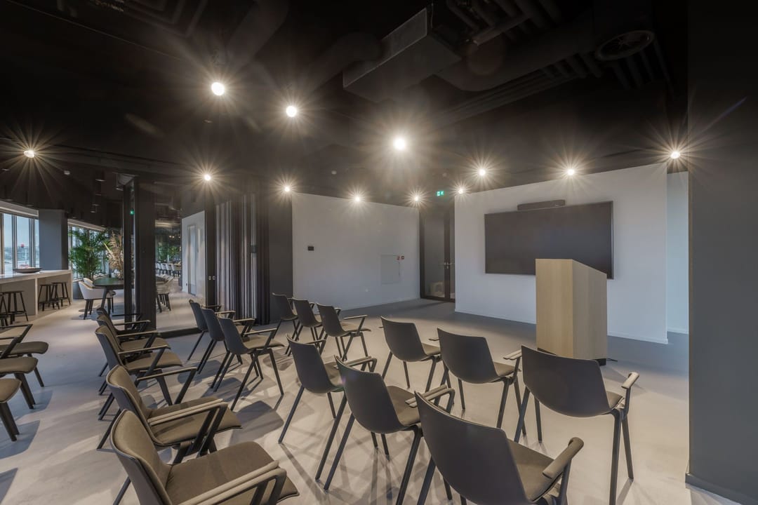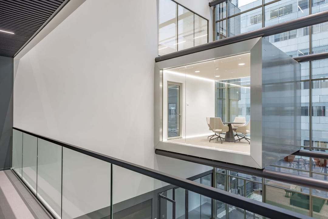 Een staalcontructie waarin op verschillende niveaus vergadercubes zijn geplaatst, is een ware eyecatcher. Deze wordt doorkruist door een prachtige glazen balustrade.