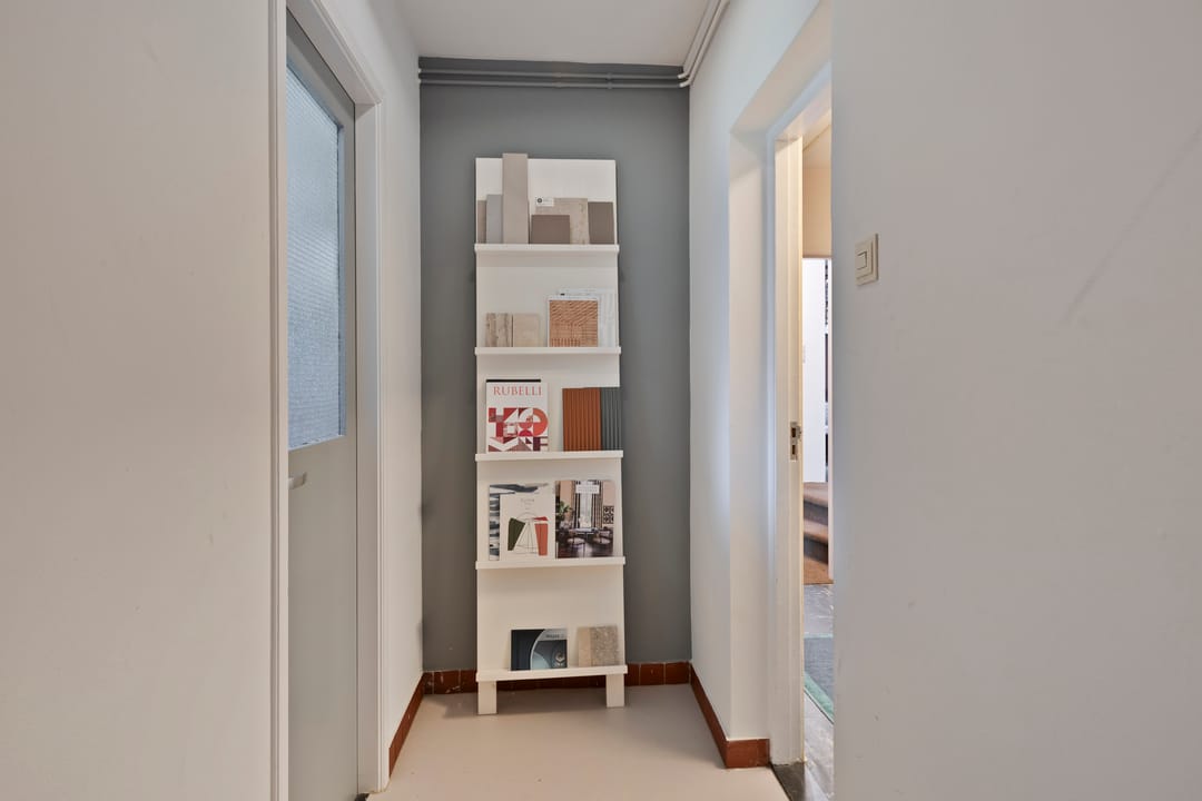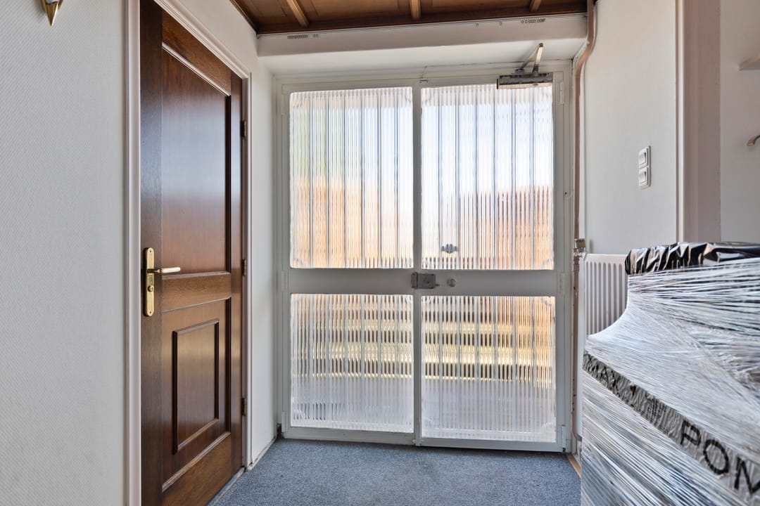 Indeling begane grond: entree, tochtportaal, woonkeuken met bijkeuken, kantoor met toegang tot het balkon, L-vormige kamer met schouw en drie toegangen tot het balkon/terras, aan de hal een toilet met voorportaal en de trapopgang naar de overige niveau's;