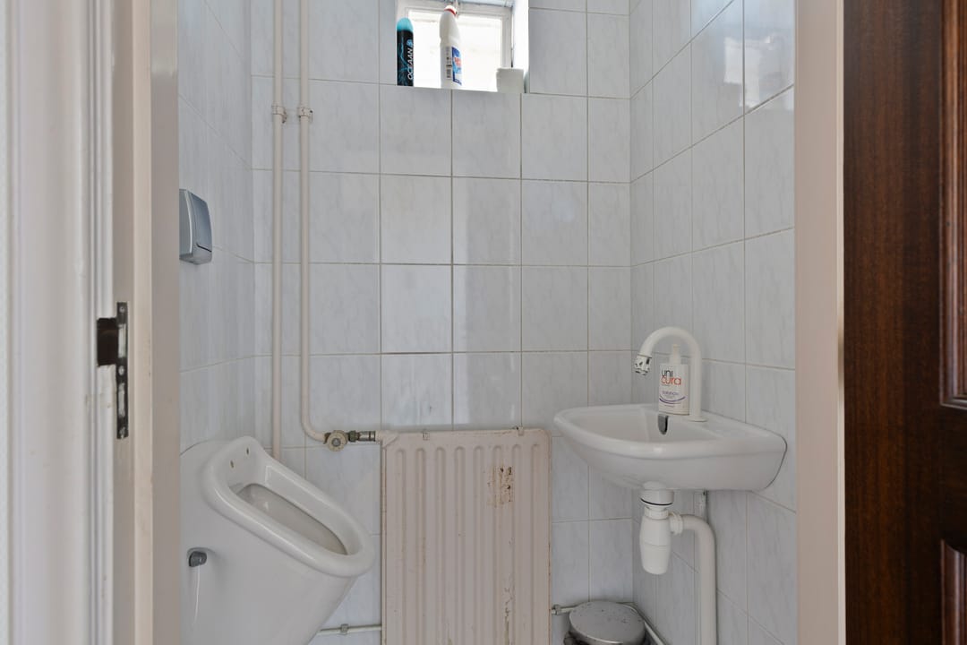 Op de eerste etage zijn een vijftal ruime kamers welke zijn voorzien van kastenwanden en één van de kamers heeft toegang tot een balkon, aan de hal een tweetal toiletten en een bijkeuken.
