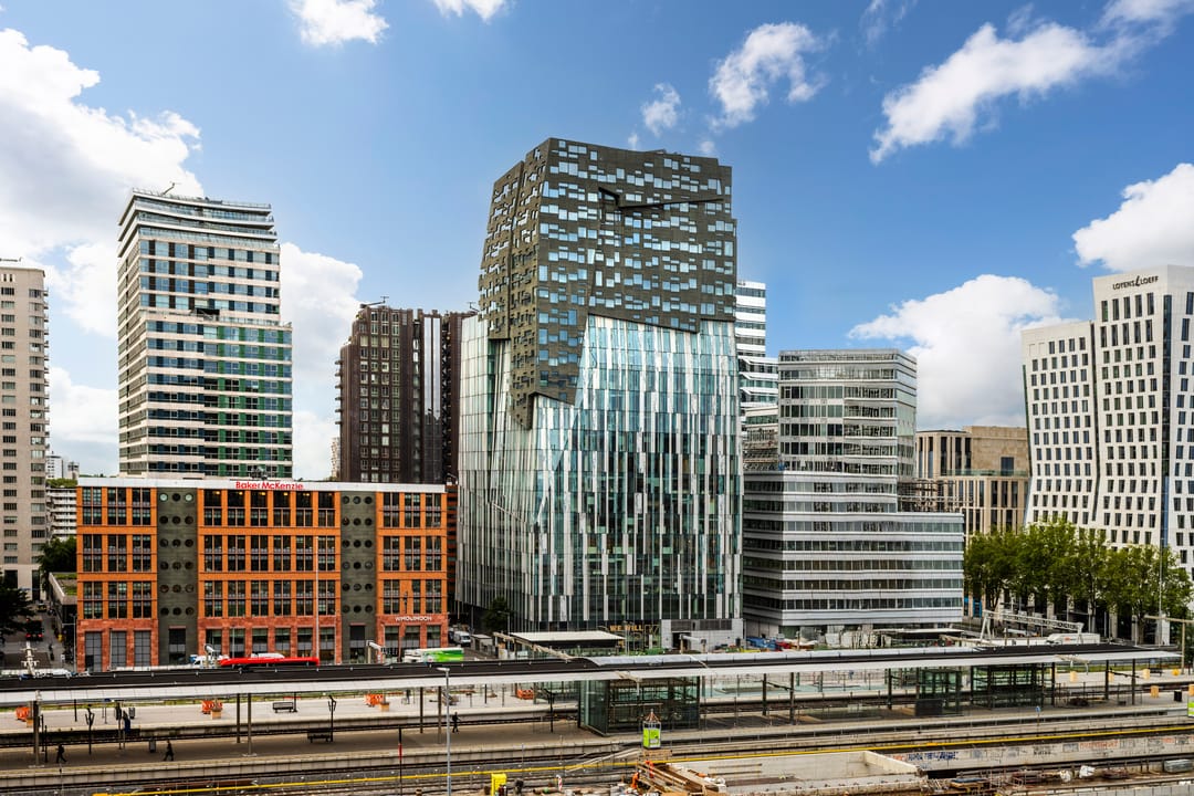 The Rock is located directly next to Amsterdam Zuid station, offering excellent connections to Schiphol (6 minutes), Amsterdam Central, Utrecht, and The Hague. The station also provides access to the North/South metro line, trams, and buses. The Zuidasdok project will further enhance accessibility by expanding the station and placing the A10 motorway underground.