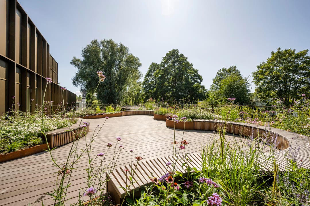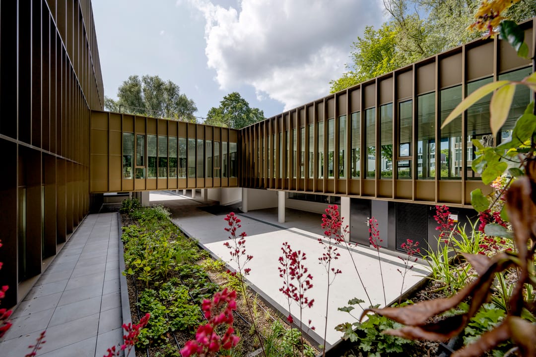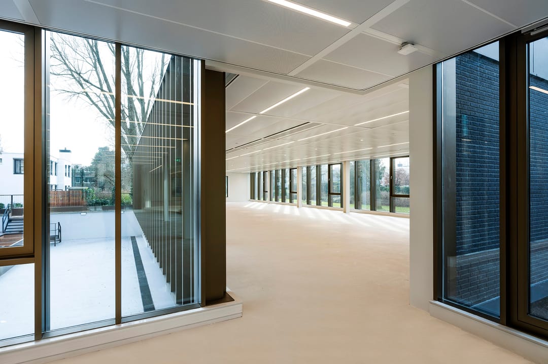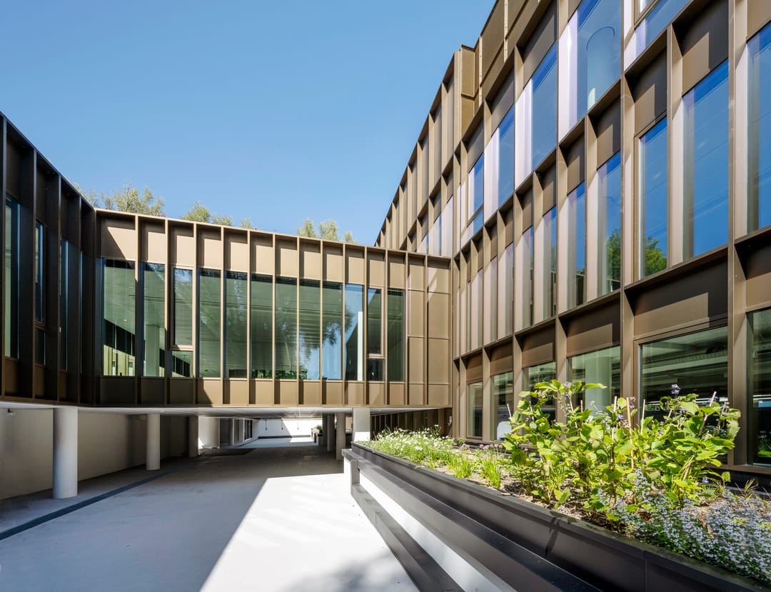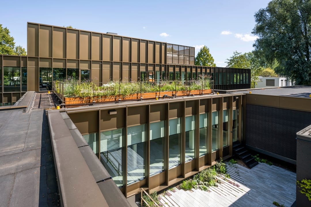Heyligers Architects transformeerde het oorspronkelijke betonnen gebouw met een zeer gesloten karakter naar een duurzaam, efficiënt, licht en transparant kantoorgebouw. De grote raampartijen met glas van vloer tot plafond zorgen voor veel natuurlijk daglicht en contact met de groene omgeving. De verticale bronzen lamellen aan de gevels zorgen voor een prettige lichtinval en dieptewerking.