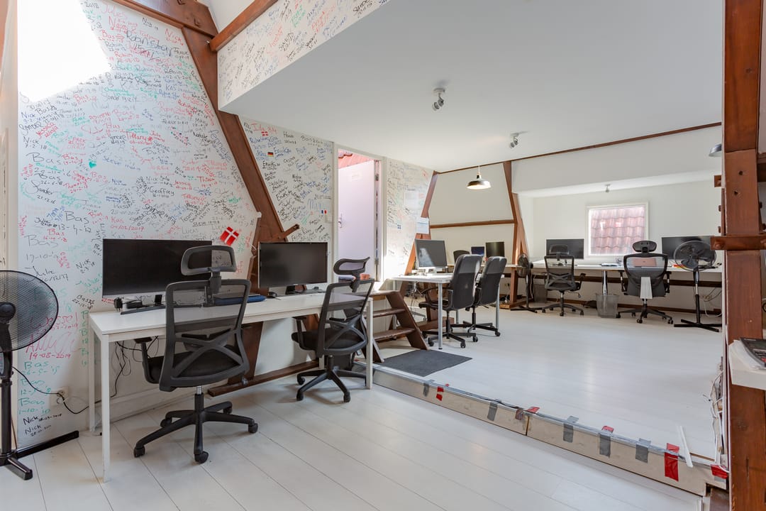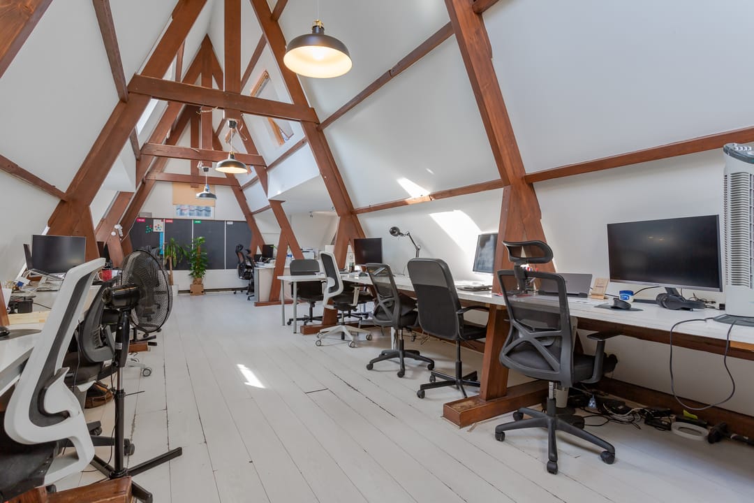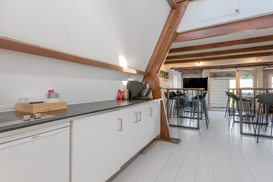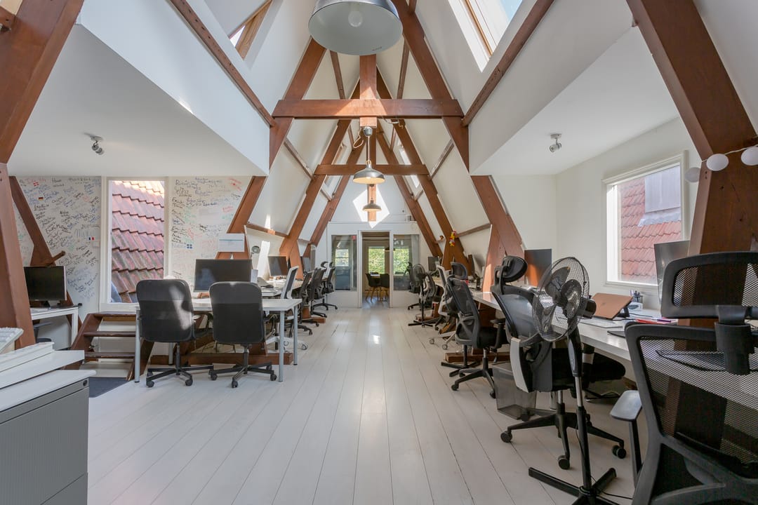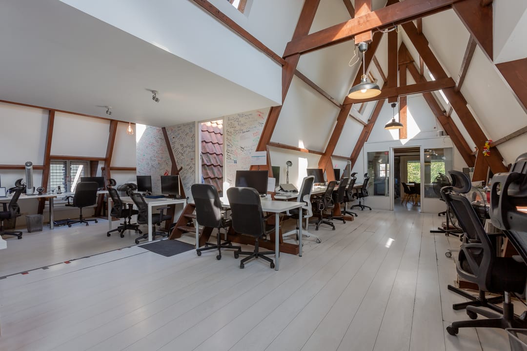 Kantoorruimte op de vierde verdieping in de pakhuizen de ‘Groote Pauw en Kleine Pauw’ gelegen aan de Oudeschans 83 en 85 te Amsterdam.