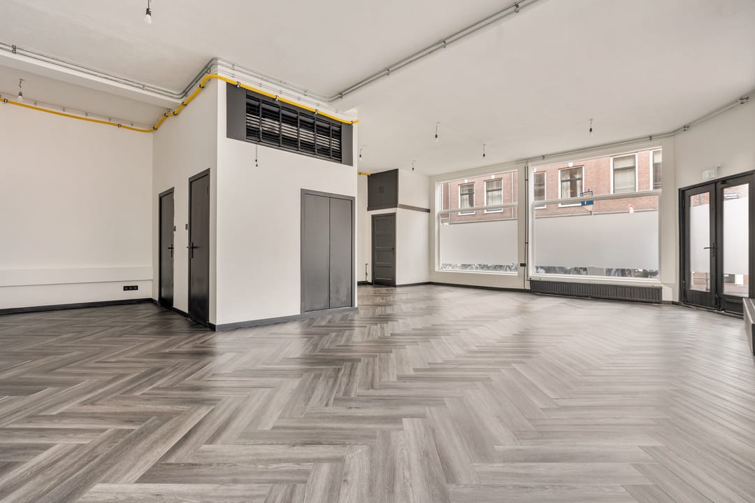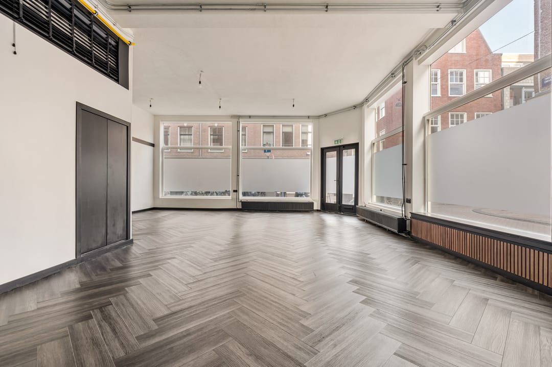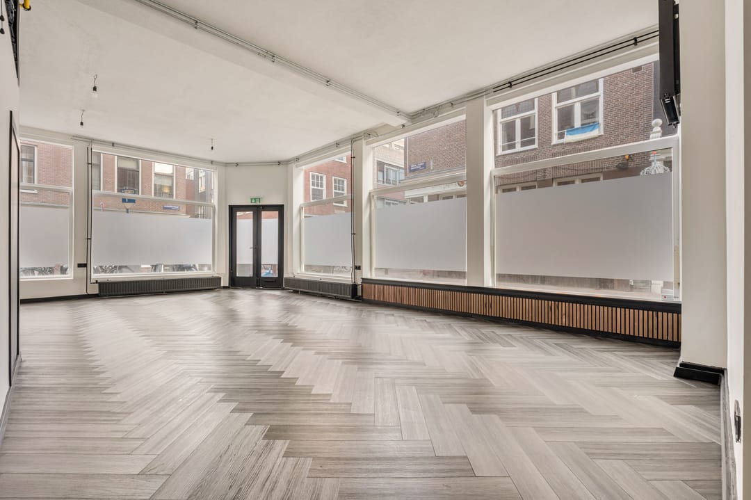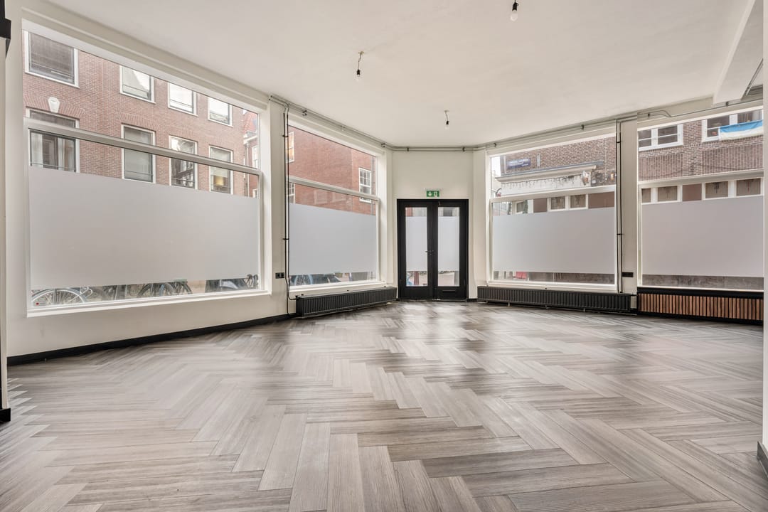 Dankzij de hoekligging en de hoge plafonds heeft de ruimte een open en lichte uitstraling met goede zichtbaarheid vanaf de straat. Een aantrekkelijke locatie voor ondernemers die zich willen vestigen op een levendige plek in het centrum van Amsterdam.