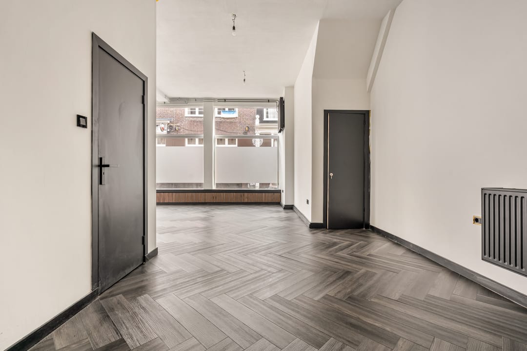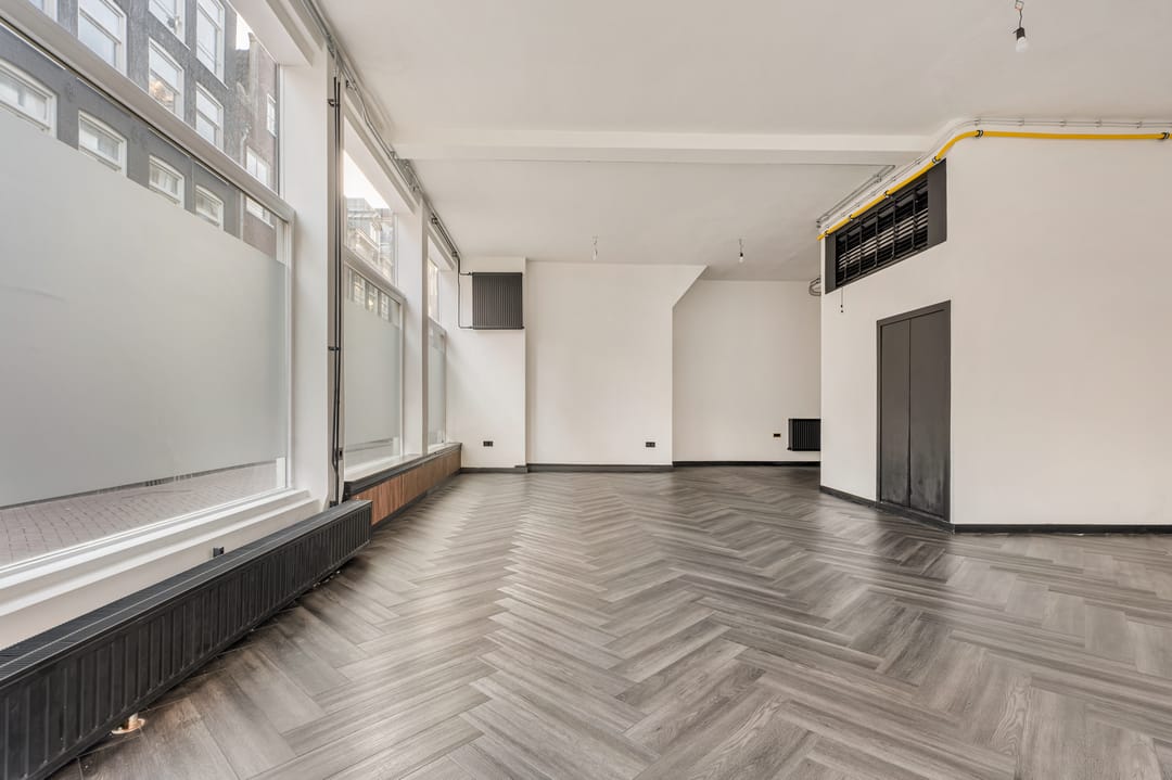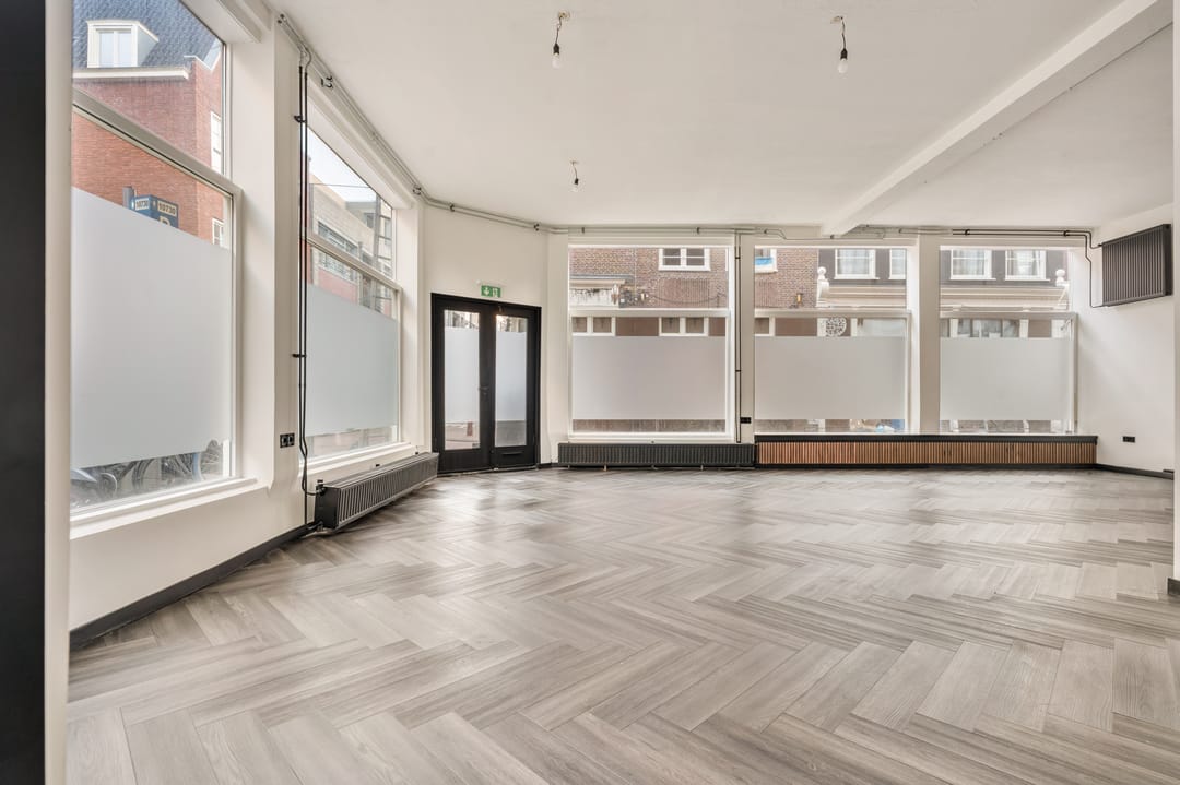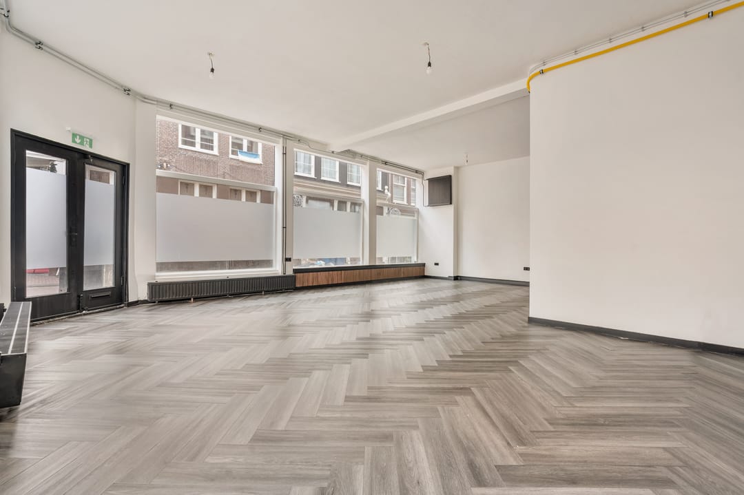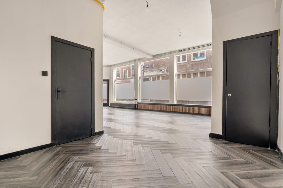 Dankzij de hoekligging en de hoge plafonds heeft de ruimte een open en lichte uitstraling met goede zichtbaarheid vanaf de straat. Een aantrekkelijke locatie voor ondernemers die zich willen vestigen op een levendige plek in het centrum van Amsterdam.