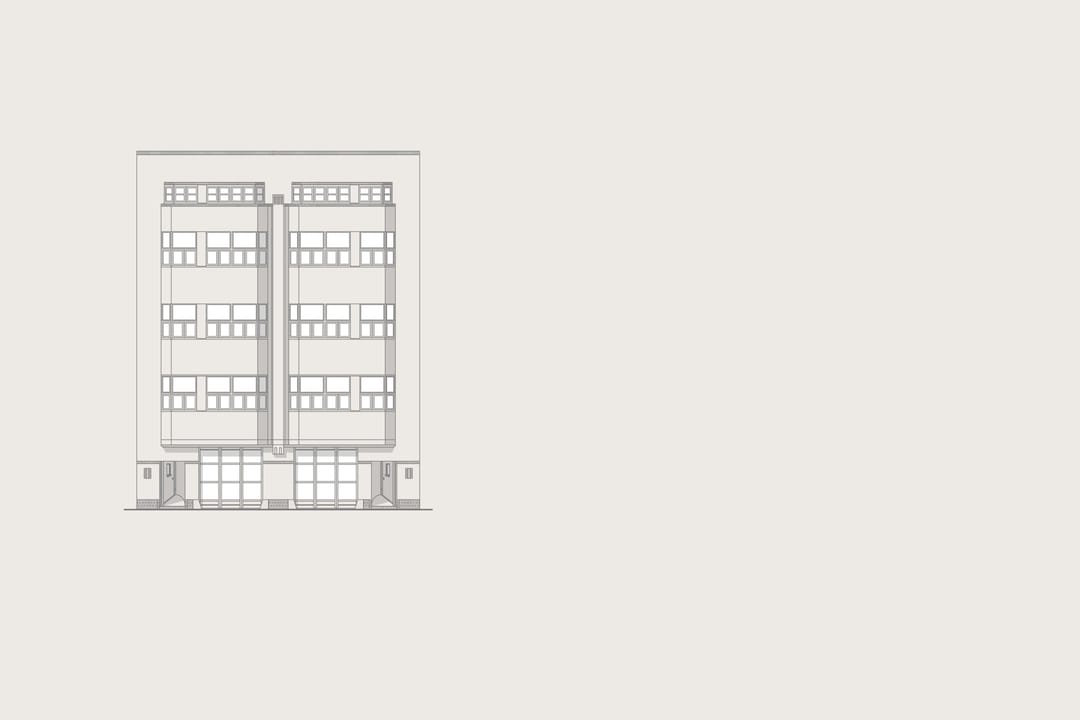 Het gebouw waar de kantoor-/bedrijfsruimte deel van uitmaakt is gebouwd in 1928 en heeft een typische jaren 30 bouwstijl. Opvallend zijn de invloeden van de Amsterdamse Schoolstijl zoals de erkers en de gevelwerking. Boven de kantoor-/bedrijfsruimte zijn vier verdiepingen met appartementen gelegen.