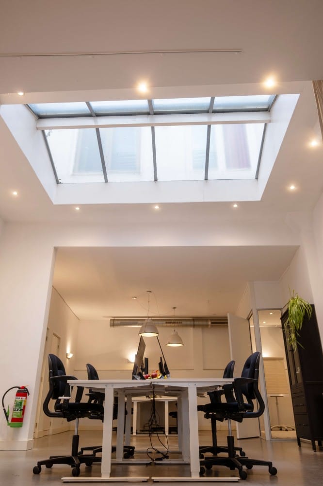 Het pand heeft een industriële uitstraling, een relatief hoog plafond en blijft aangenaam koel in de zomer. Ideaal voor 10–14 werkplekken.