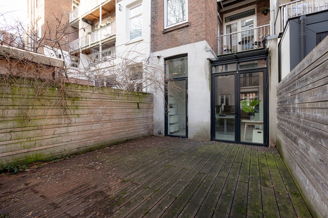 Aan de achterzijde van de kantoorruimte is via openslaande deuren een tuin bereikbaar van circa 27 m². De tuin is omsloten met een stijlvolle schutting en afgewerkt met vlonders, wat zorgt voor een gezellige en verzorgde buitenruimte. De elektrisch bedienbare zonwering draagt bij aan een aangenaam verblijf en biedt extra comfort op zonnige dagen.