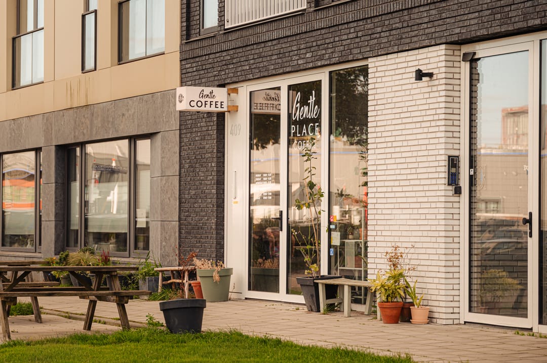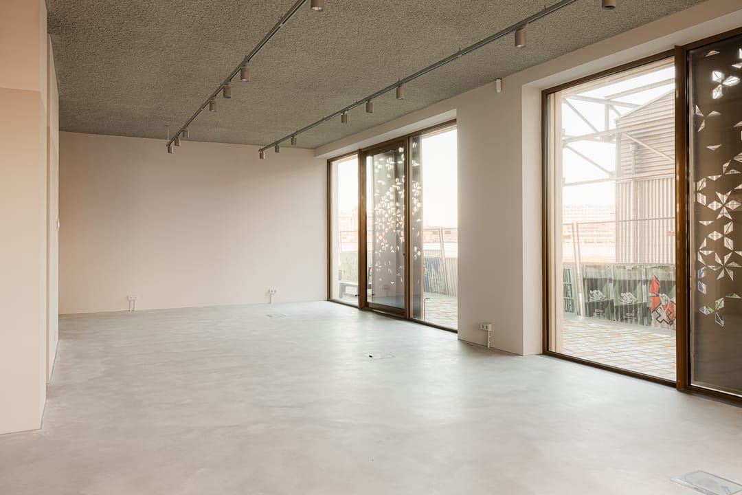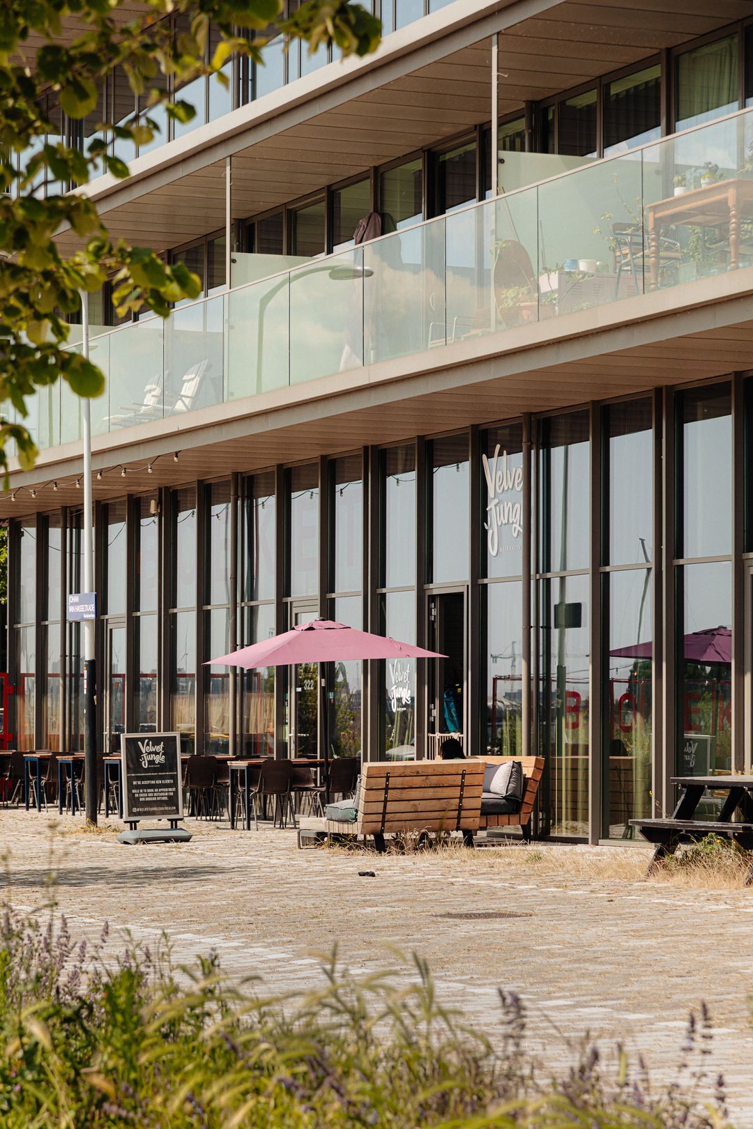Aan de zijkant van de ruimte bevindt zich een gezellige buitenruimte, ideaal om even buiten te zitten voor een kop koffie, een lunch of een borrel. Met de ligging op het zuidwesten profiteer je van volop middag- en avondzon, terwijl je uitkijkt over het steeds veranderende panorama van het IJ. Een plek die rust uitstraalt, maar tegelijkertijd volop leeft.