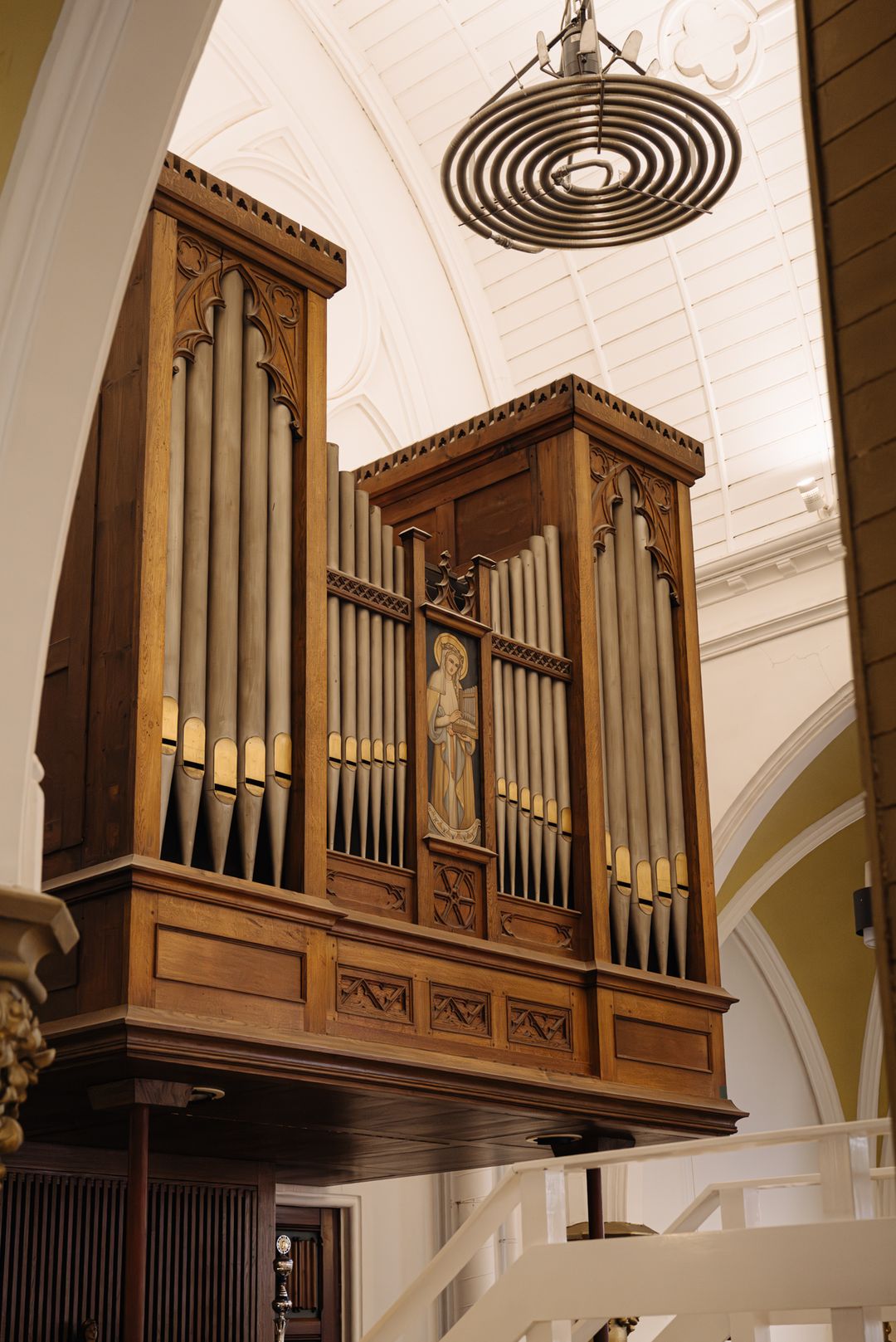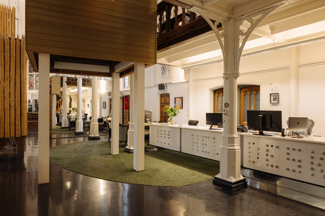 De kapel vormt het hart en daaromheen liggen gangen, voormalige kloosterruimtes, een hostiebakkerij en woonvertrekken die door de jaren heen hun functie hebben veranderd. De hoogte van de kapel blijft voelbaar, maar het houten fort brengt intimiteit: open en besloten tegelijk. Op het orgelbalkon boven de entree zijn werkplekken ingericht met uitzicht over de hele kapel.