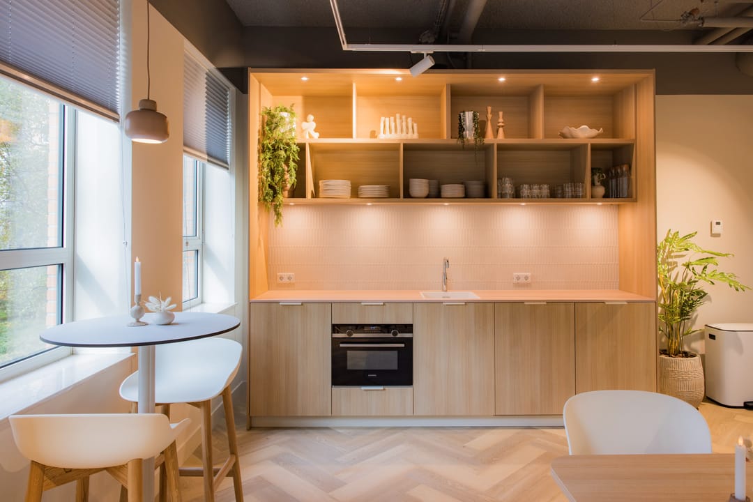 straalt serene eenvoud en zachte verfijning uit. Lichte houtsoorten, aardse pastels en natuurlijke materialen creëren een rustig, minimalistisch interieur dat focus bevordert zonder afleidingen.