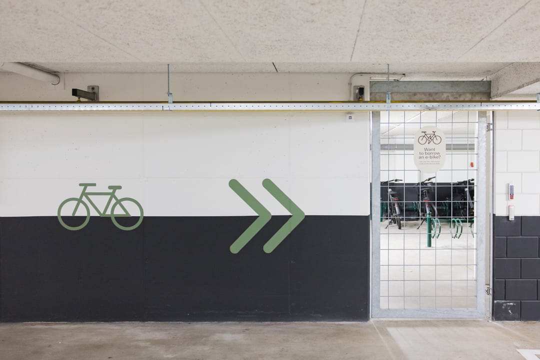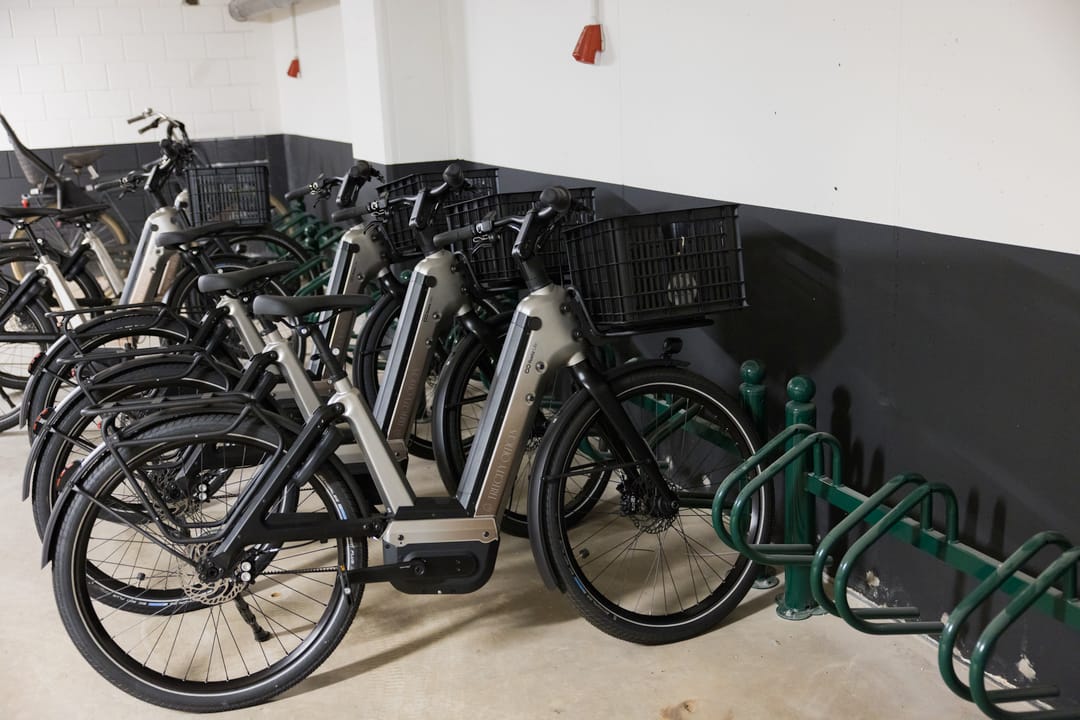 Fietsen: afgesloten fietsenstalling met e-bike laadpunten.