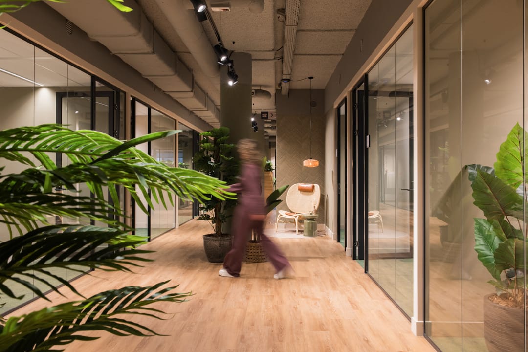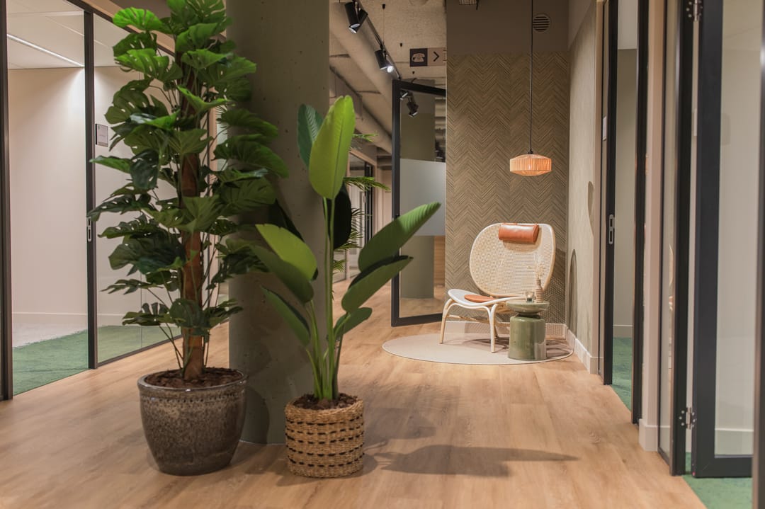 haalt de buitenwereld naar binnen. Organische materialen, weelderige planten, natuursteen en volop daglicht zorgen voor een open, kalme sfeer waarin concentratie en ontspanning hand in hand gaan.