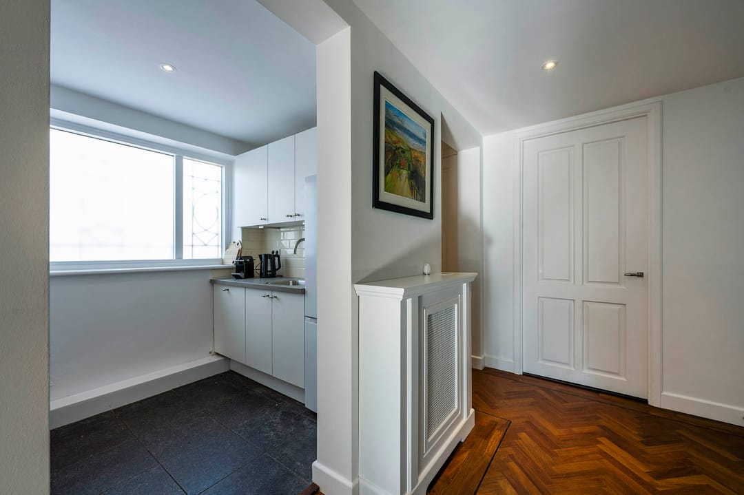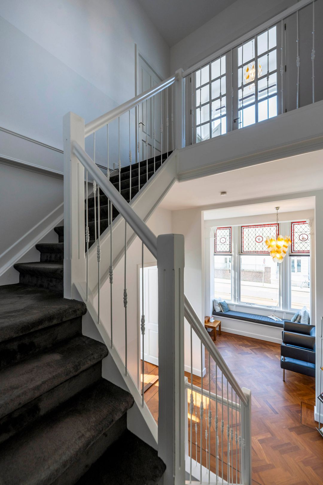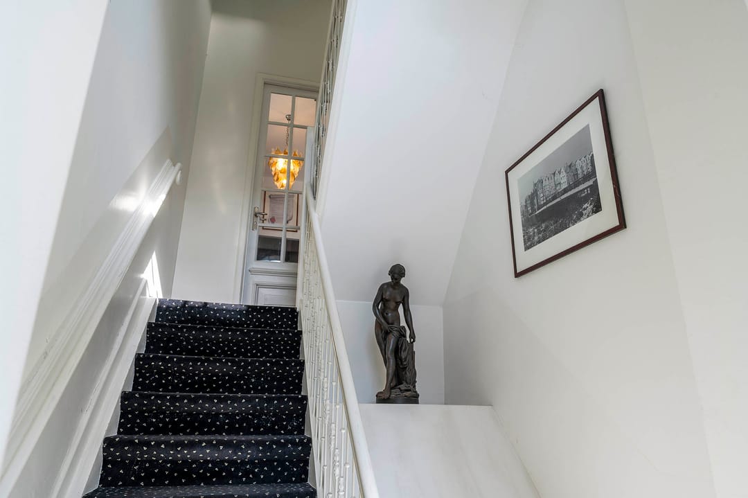 De entree van het pand is aan de zijkant gevestigd en komt uit op de bel-etage. Via de entree kom je in de hal waar de erker met glas-in-lood ramen niet alleen uitzicht geven op de Van Baerlestraat maar ook de hal oplichten. Deze verdieping biedt nog eens drie kantoorkamers en heeft een brede opzet voor de trap naar het souterrain en de 1ste verdieping. De bel-etage is ca. 73 m2 groot.