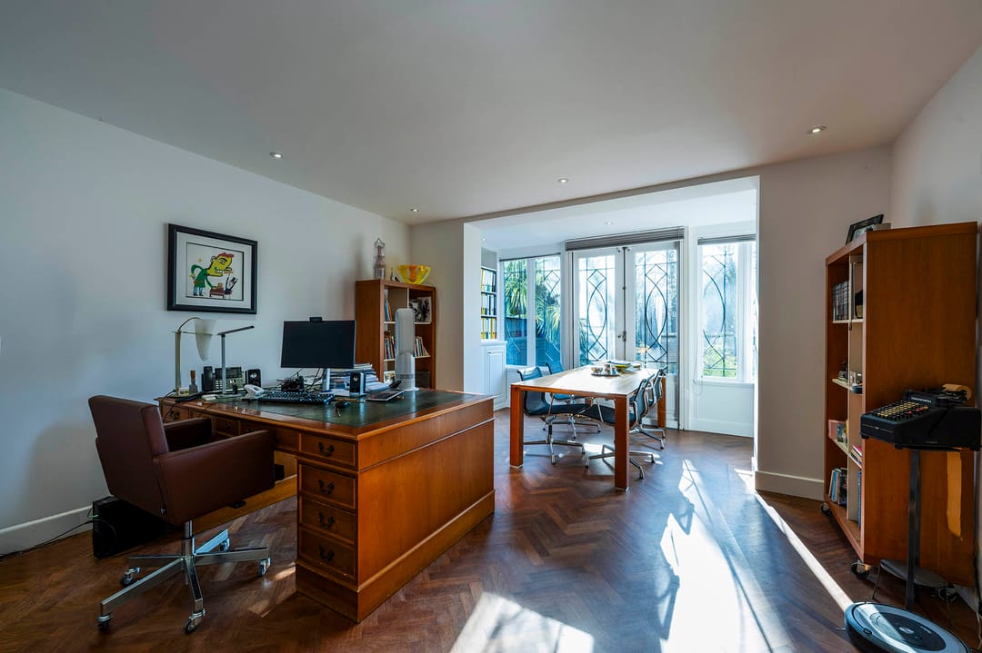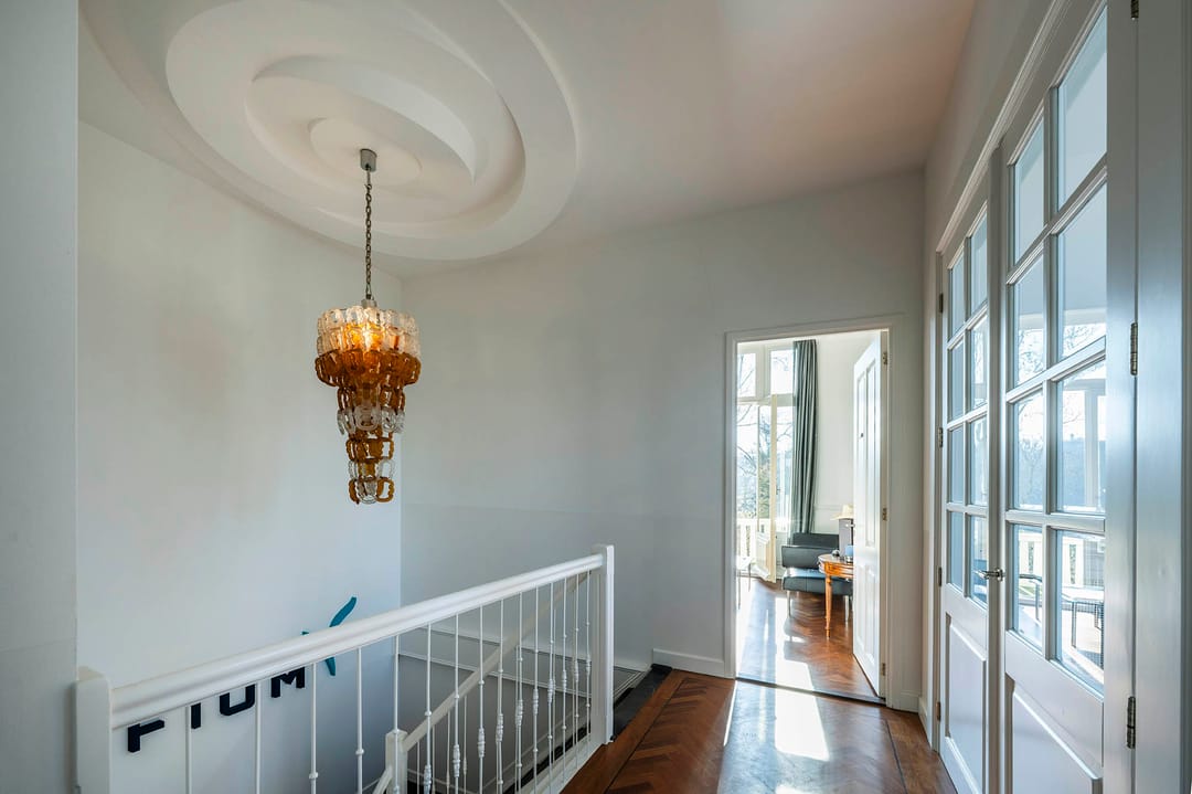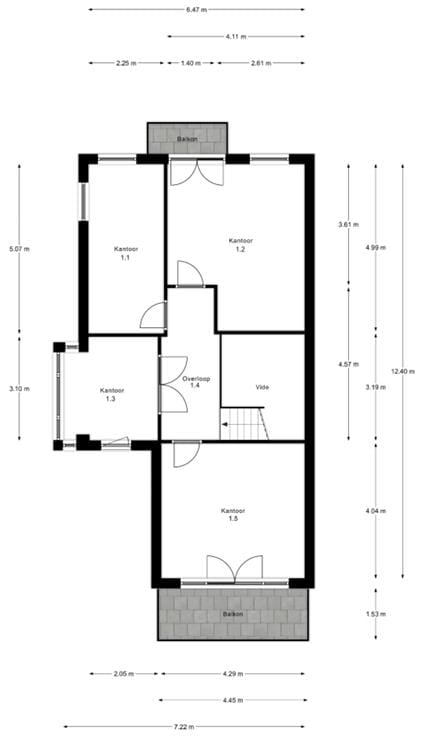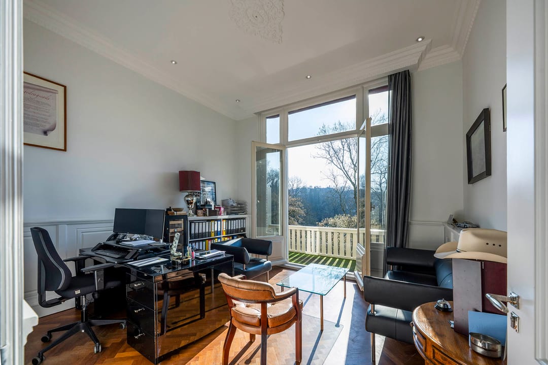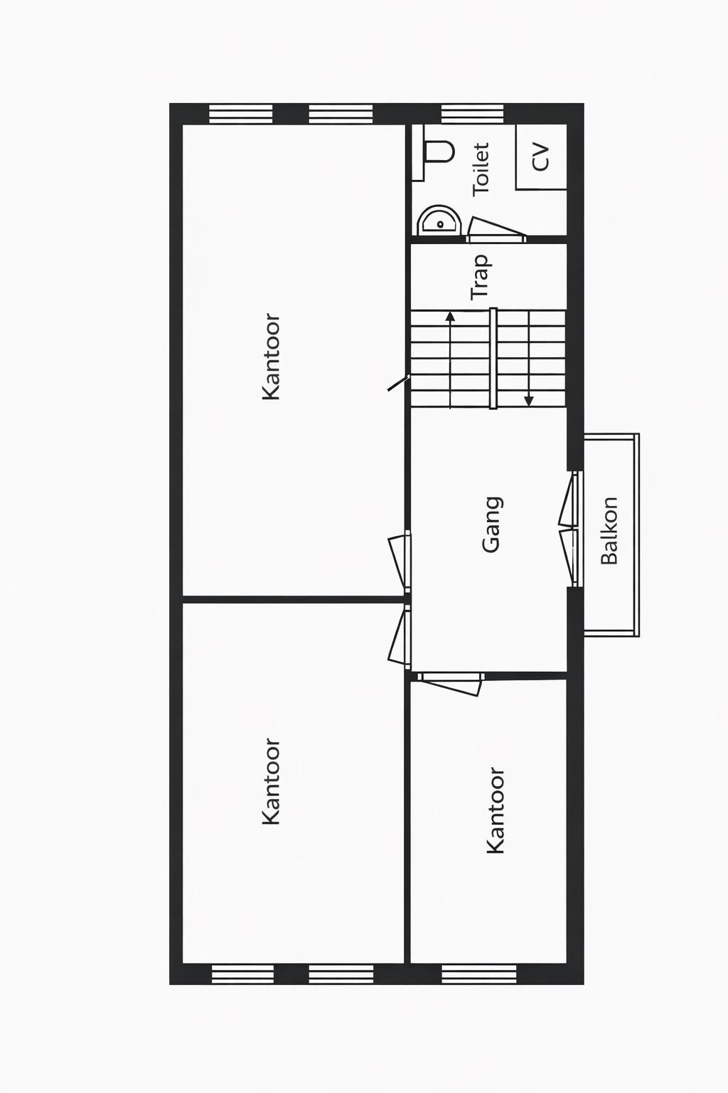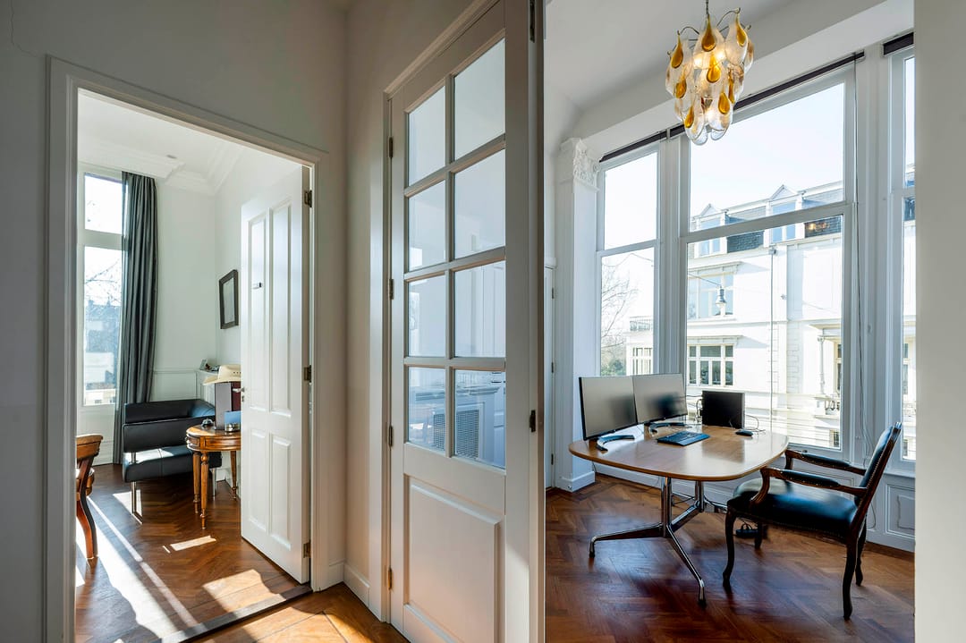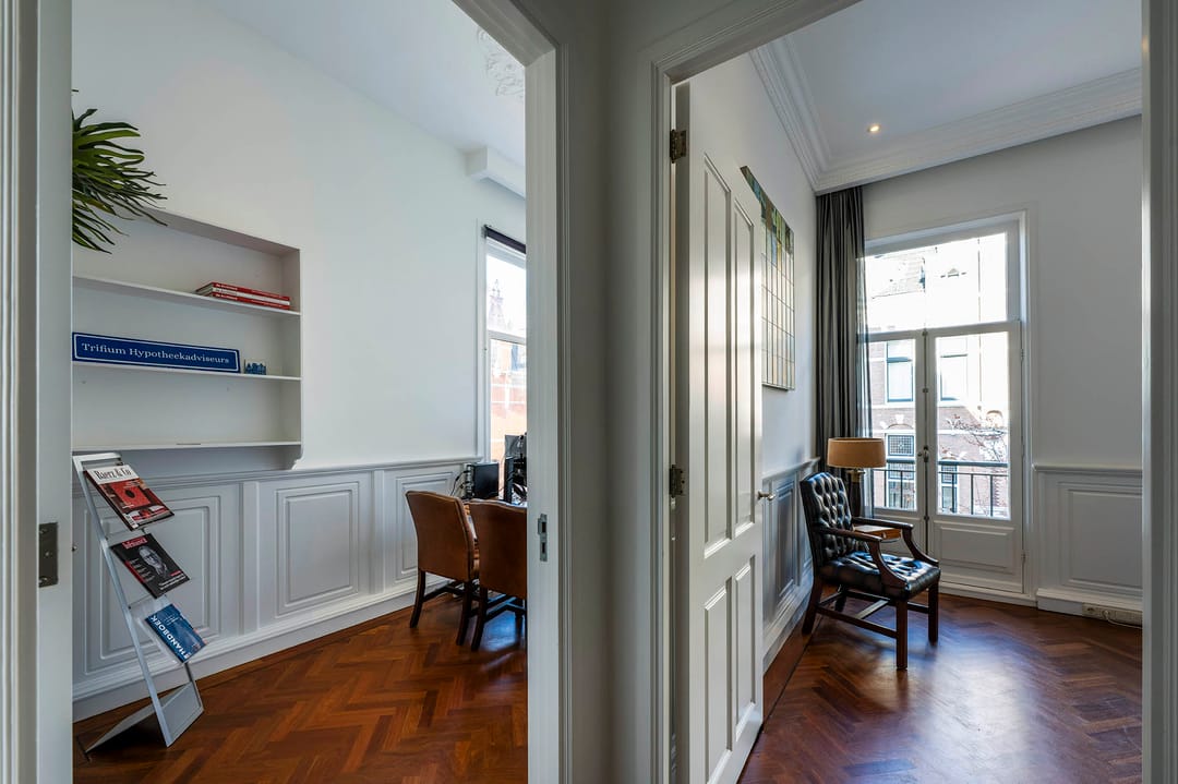 De eerste verdieping is ca. 67 m2 groot en onderverdeeld in vier kantoorkamers. Naast de erker met een brede raampartij biedt deze verdieping zowel voor als achter een balkon die toegankelijk zijn via openslaande deuren.
