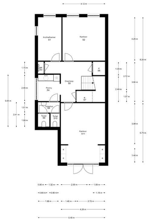 Het pand bestaat uit 5 verdiepingen met in totaal 346 m2 verdeeld over; souterrain, bel-etage, eerste-, tweede- en derde verdieping. Het souterrain beslaat een totaal van ca. 80 m2 waar op dit moment twee kantoorkamers en een archiefkamer bevinden. De pantry en de toiletgroepen zijn op deze verdieping gelegen. De tuin is vanuit deze verdieping te bereiken door middel van openslaande deuren.