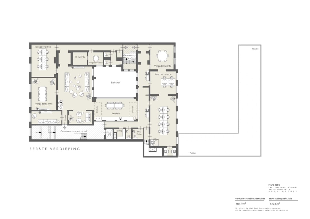 De kantoorruimte wordt voorzien van een volwaardige luxe keuken op de eerste verdieping. Dit biedt niet alleen extra comfort en functionaliteit, maar creëert ook de mogelijkheid om (een deel van) de ruimte separaat te verhuren, waardoor flexibiliteit in gebruik en exploitatie wordt vergroot. De verwachting is dat het gehuurde medio Q3 2026 wordt opgeleverd.