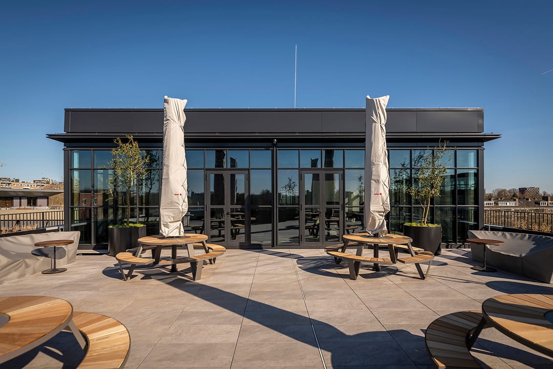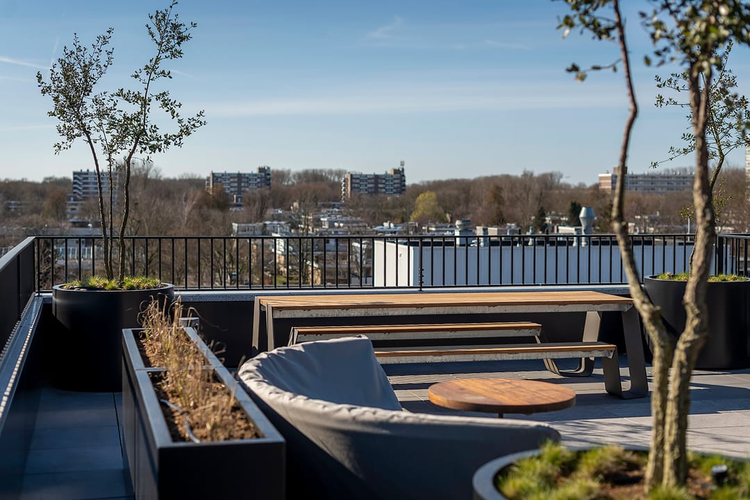 Wat dit kantoorpand echt bijzonder maakt zijn de gemeenschappelijke vergaderruimten, turn-key-units en het prachtige gemeenschappelijke dakterras op de vierde verdieping.