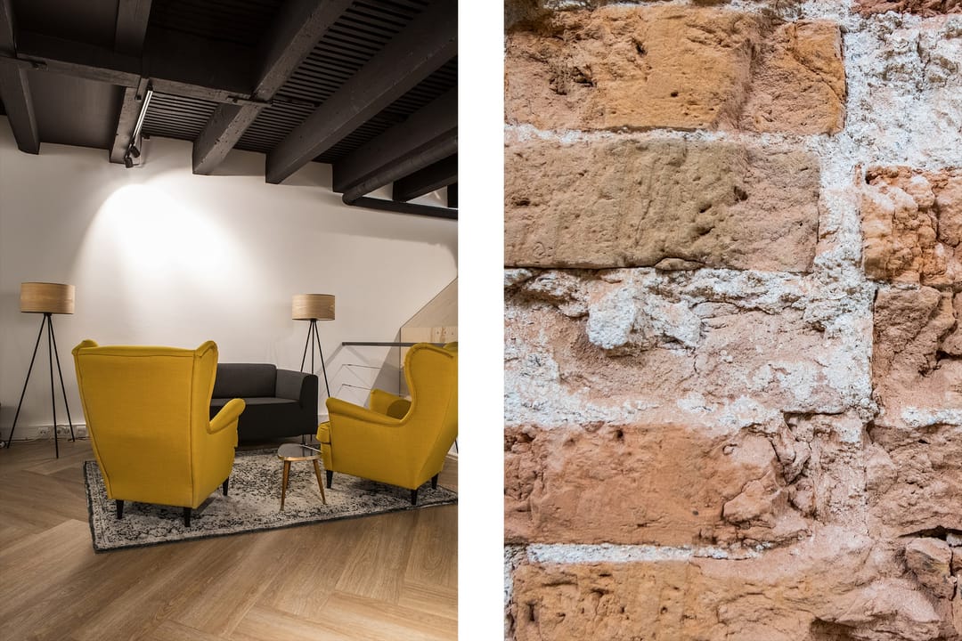 - plafond met orginele balken in het zicht en voorzien van akoestische panelen tussen de balken;