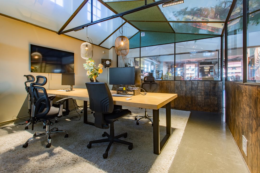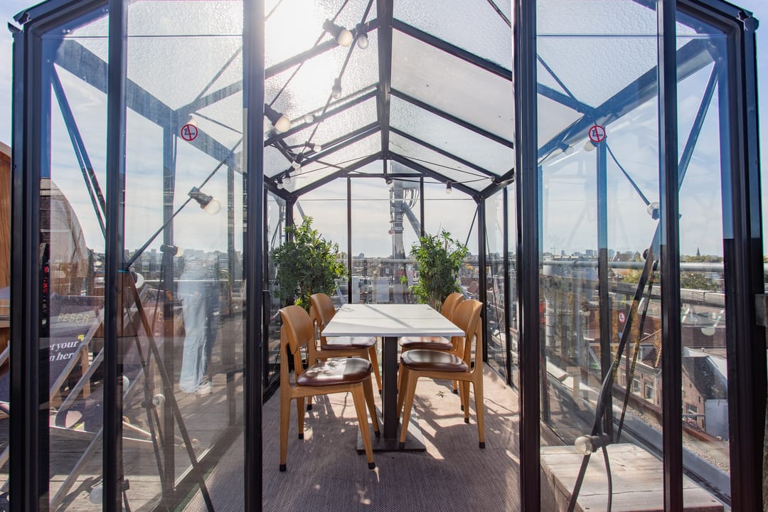 Ruim 300 m² verdeeld over twee verdiepingen gelegen boven het restaurant Pesca. Écht een uniek kantoor. Dit Plekky heeft een super handige inrichting; veel meetingruimtes met glazen schuifdeuren, handig als je meetings hebt of geconcentreerd wilt werken. Ook is er op het dakterras een kas waar je meetings kan doen! Ja, je hoort het goed. Dat is écht indruk maken op je klanten ;)