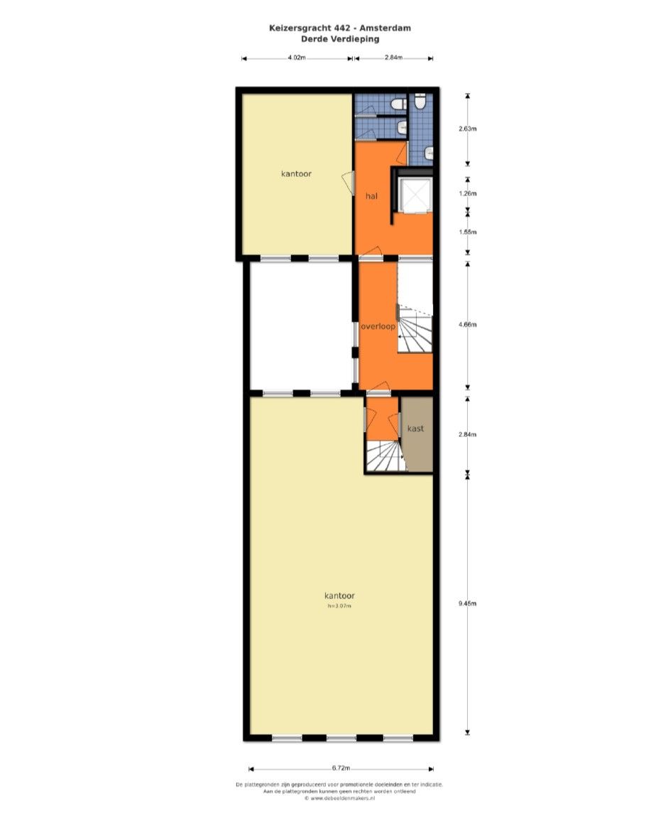 De totale verhuurbare oppervlakte (v.v.o.) bedraagt circa 714 m² v.v.o, (conform NEN2580) en is verdeeld over 6 bouwlagen (inclusief souterrain). Voor verhuur is 249,52 m² v.v.o. kantoorruimte beschikbaar op de derde en vierde verdieping van het gebouw. De ruimtes zijn verdeeld over een voor-en achterhuis.
