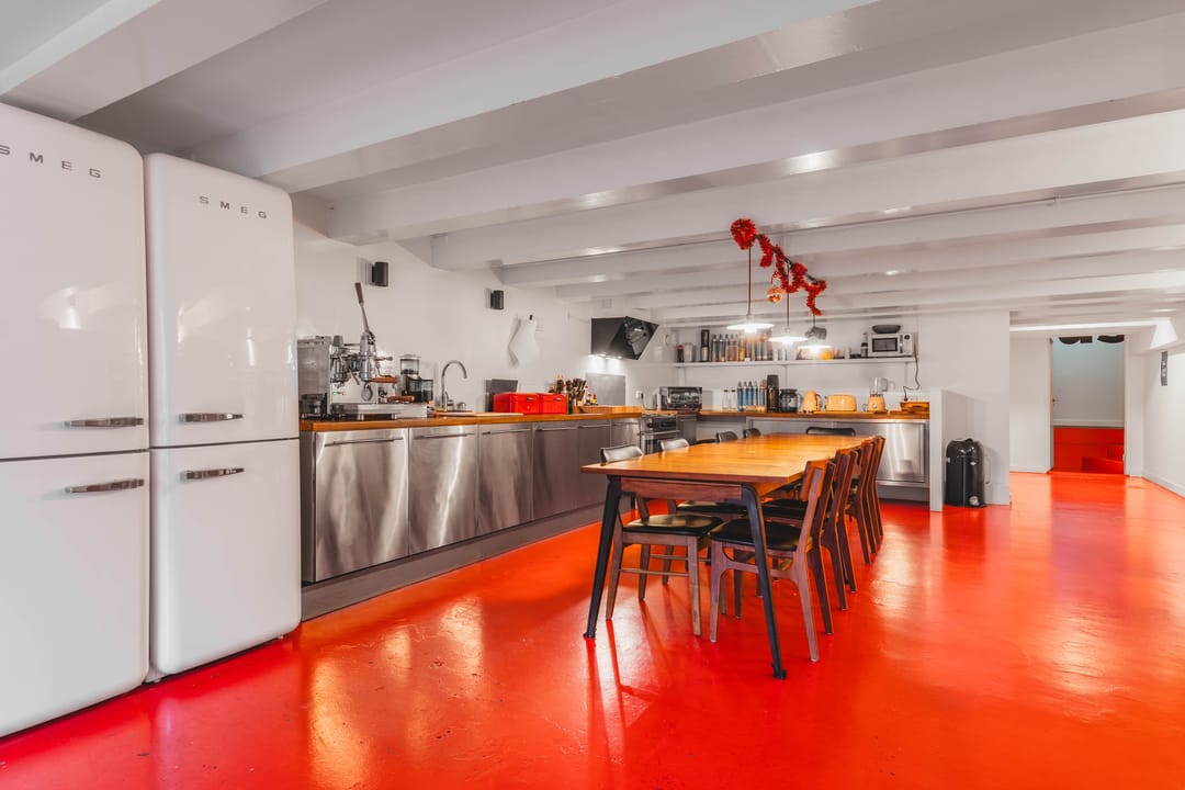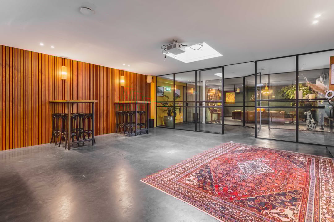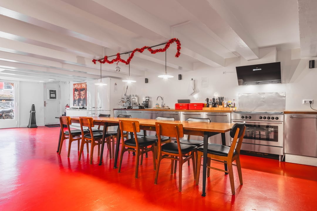 Bij binnenkomst bevindt zich aan de voorzijde het sociale hart van het kantoor in de vorm van een ruime en volledig uitgeruste keuken van circa 60 m². Deze ruimte is geschikt voor gezamenlijke lunches, informele overleggen en interne bijeenkomsten. De keuken is voorzien van luxe en moderne inbouwapparatuur.
