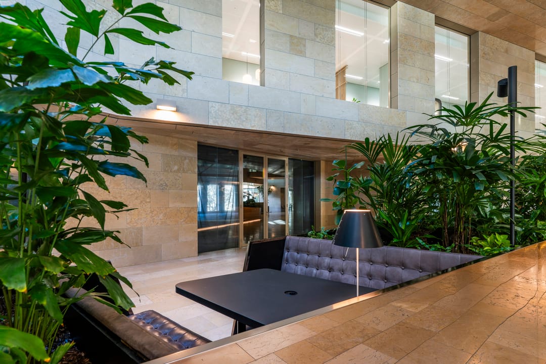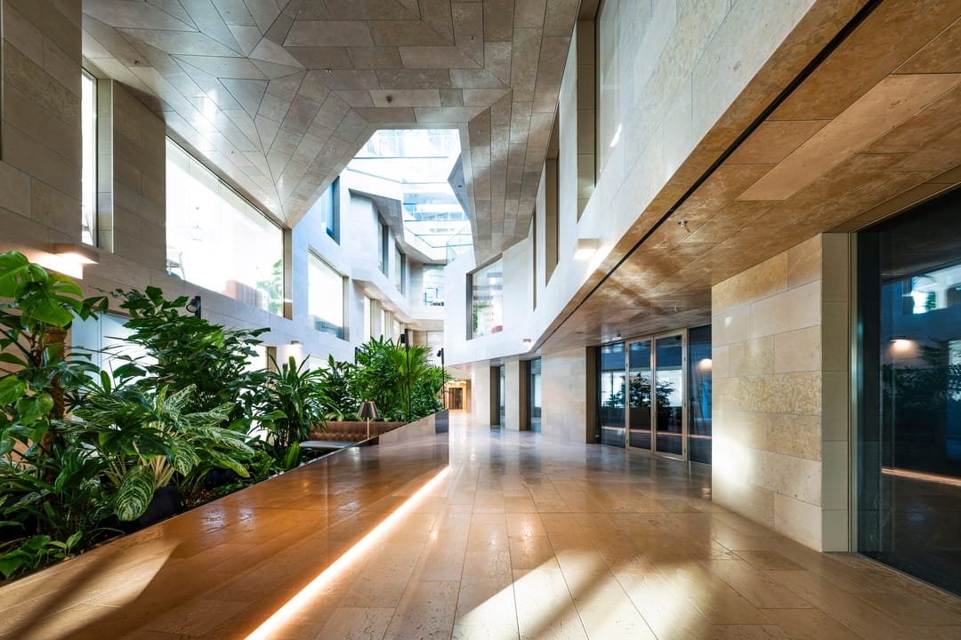- The atrium has three elevator cores, which connect the office floors to the atrium